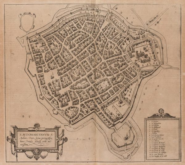 Franz Hogenberg (1535 Mechen – 1590 Cologne), together with Georg BRAUN (1541 Cologne – 1622 ibid.), Map of Saint-Omer, Pas-de-Calais, France, , Etching