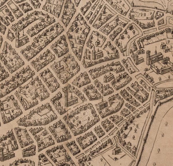 - Beschreibung: Vedute aus dem Umkreis des Werkes von Frans HOGENBERG (1535 Mechelen – 1590 Köln) und Georg BRAUN (1541 Köln – 1622 ebd.): Civitates Orbis Terrarum. De Praecipuis, Totius Universi Urbibus, Köln 1593. Nach dem Vorbild der Kartenwerke des Abraham Ortelius (1527 Antwerpen – 1598 ebd.).