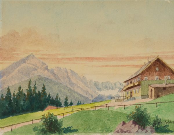 Friedrich Hollfelder (20. Jahrhundert), Bauernhaus am Fuß der Zugspitze, um 1940, Aquarell