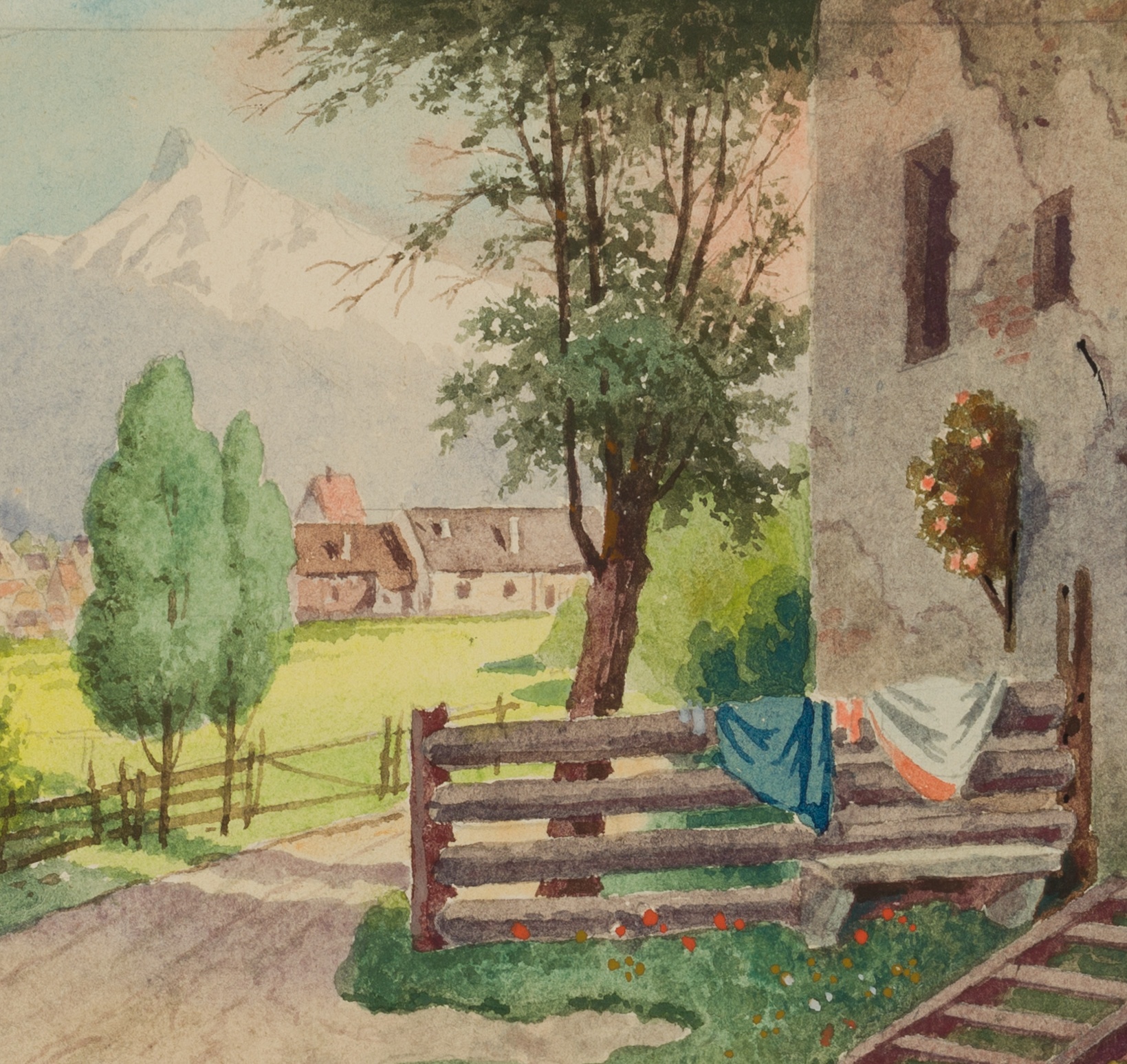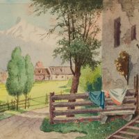 - Description: View of the entrance to a farmhouse, with the Alps in the background.