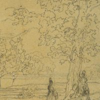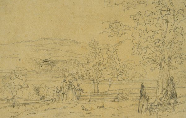 - Description: Without designation. From a hill the viewers look down on the town of Lichtenau in Middle Franconia, which can be seen in the middle ground. In the foreground two groups of figures seem to be enjoying the view, they are standing by a wooden fence or have taken a seat on a bench in the shade of a tree.