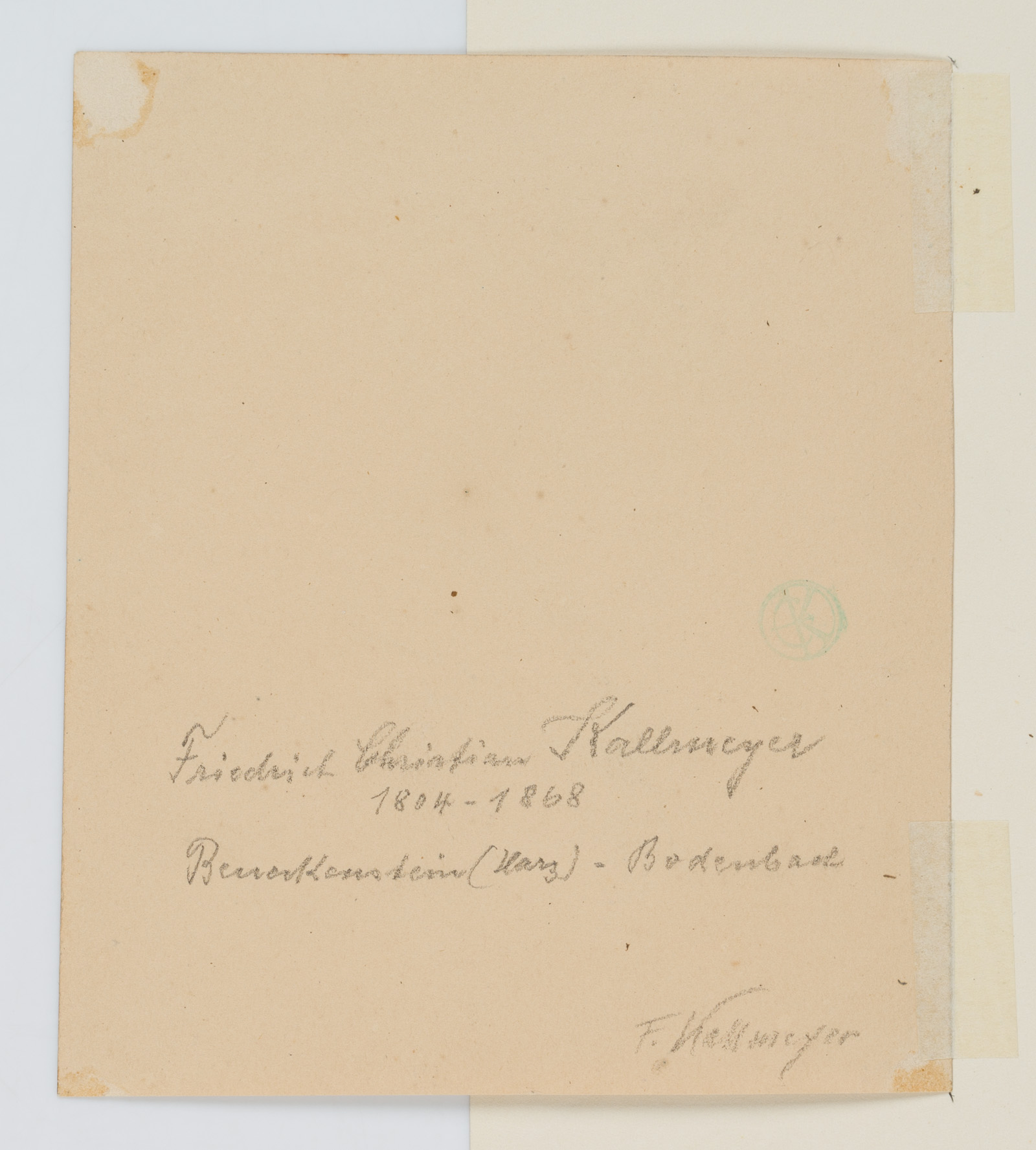 - Description: Kallmeyer moved in Dresden circles of young artists such as Ernst Rietschel, Julius Thaeter, Heinrich Wilhelm Georg, Carl Julius Milde and Anton Wilhelm Schilde. He studied at the Dresden Academy, where he learned to copy classics from the Dresden Picture Gallery. Among his patrons was Bernhard von Lindenau. Among Kallmeyer’s well-known drawings and paintings, his portraits are particularly noteworthy.