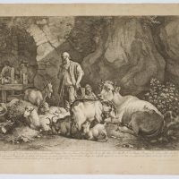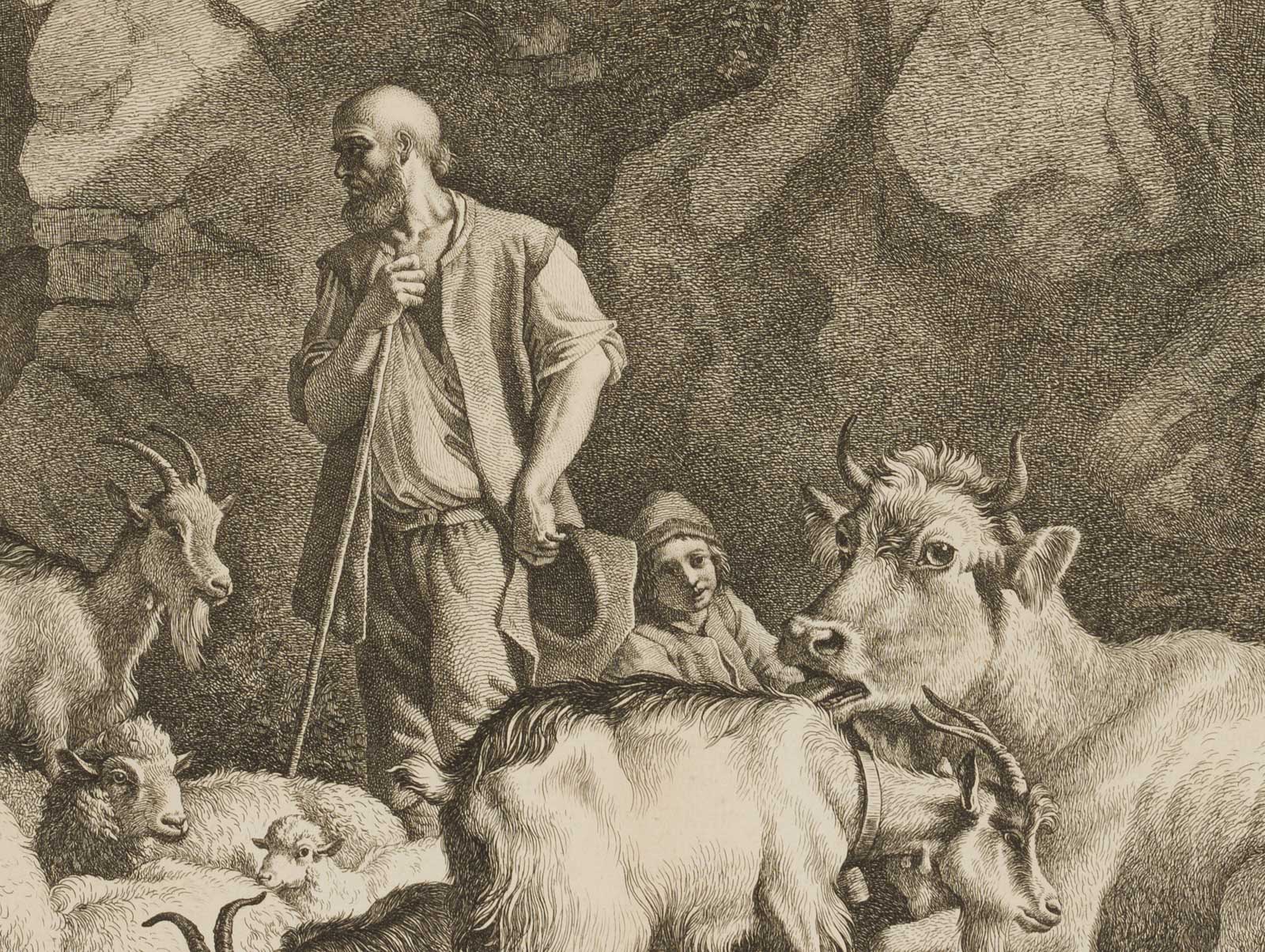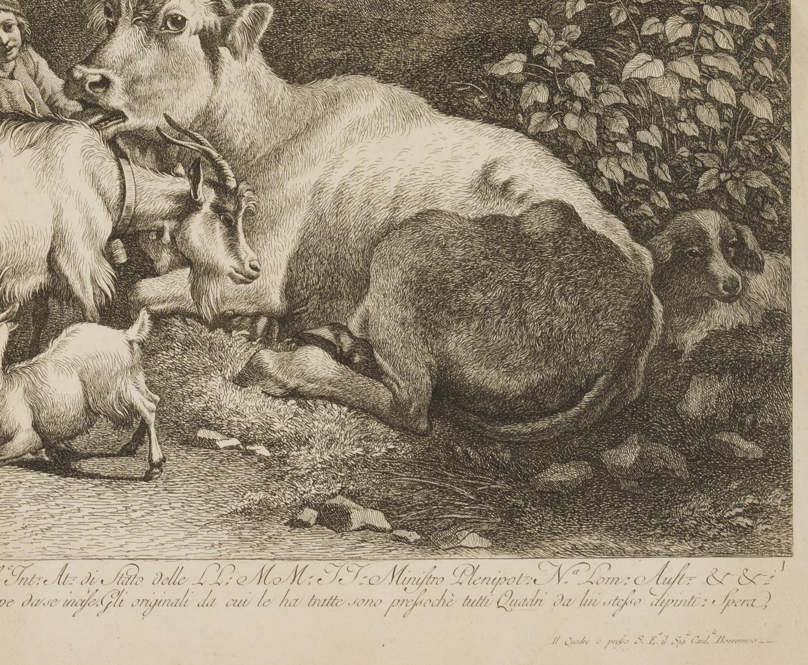 Francesco Londonio (1723 Mailand – 1783 ebd.), Hirte mit vor einer Herde aus Schafen, Ziegen und Kühen, um 1750, Radierung