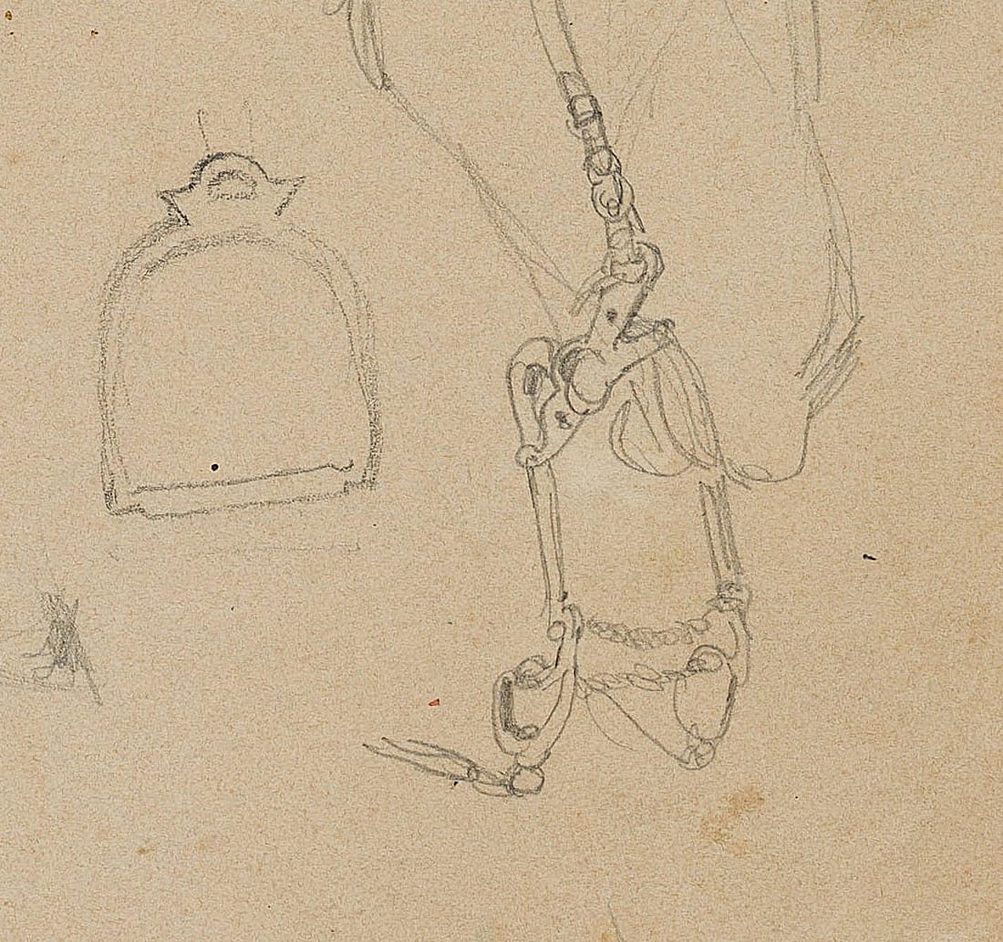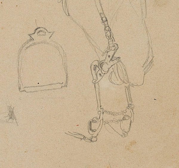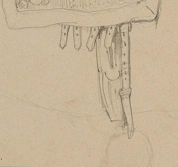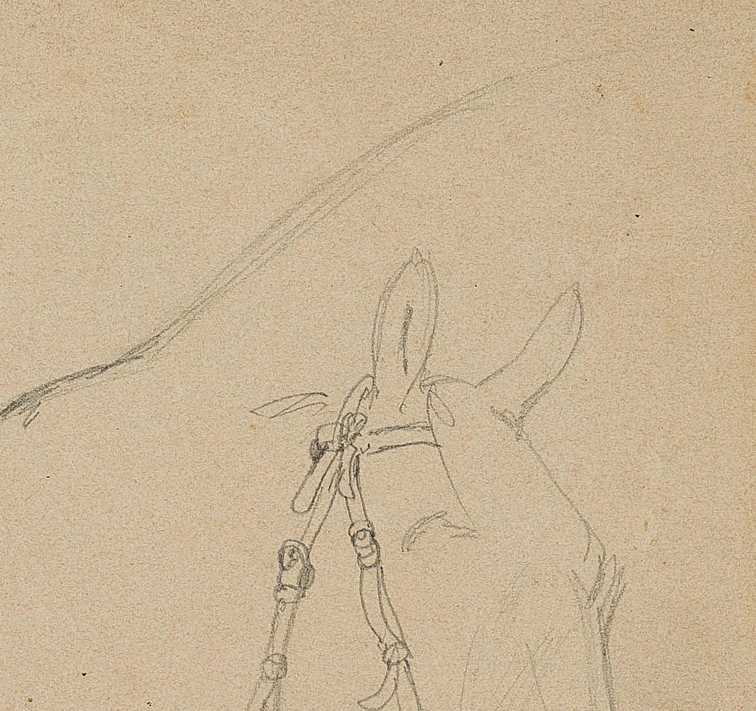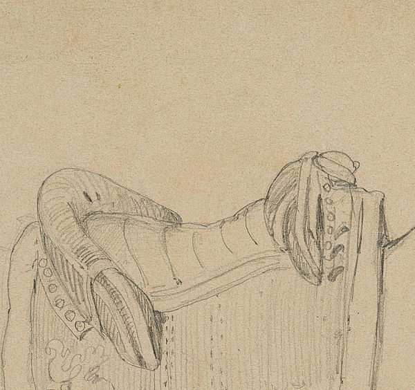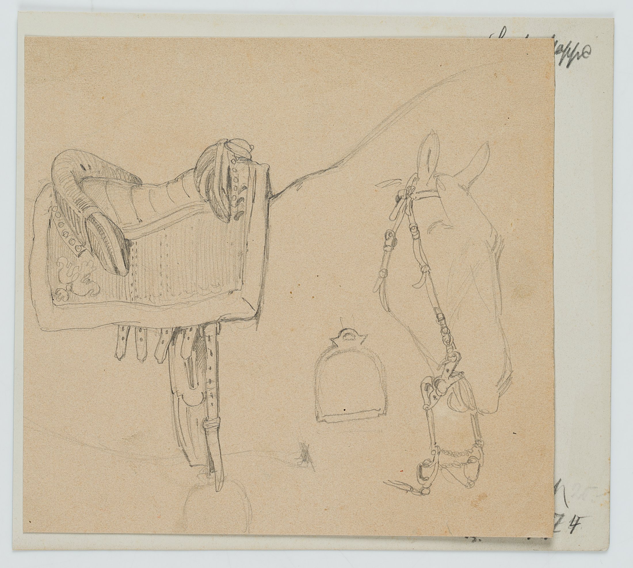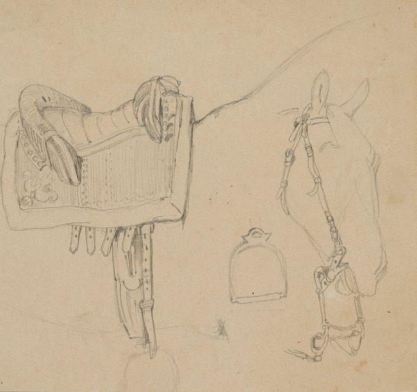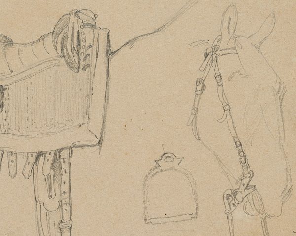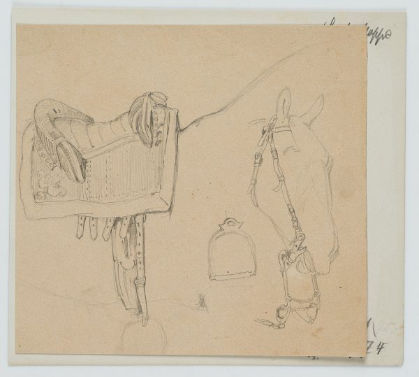- Description: Study sheet with drawing of an elegant riding saddle as well as a simple bridle with snaffle on a sketched horse’s head.