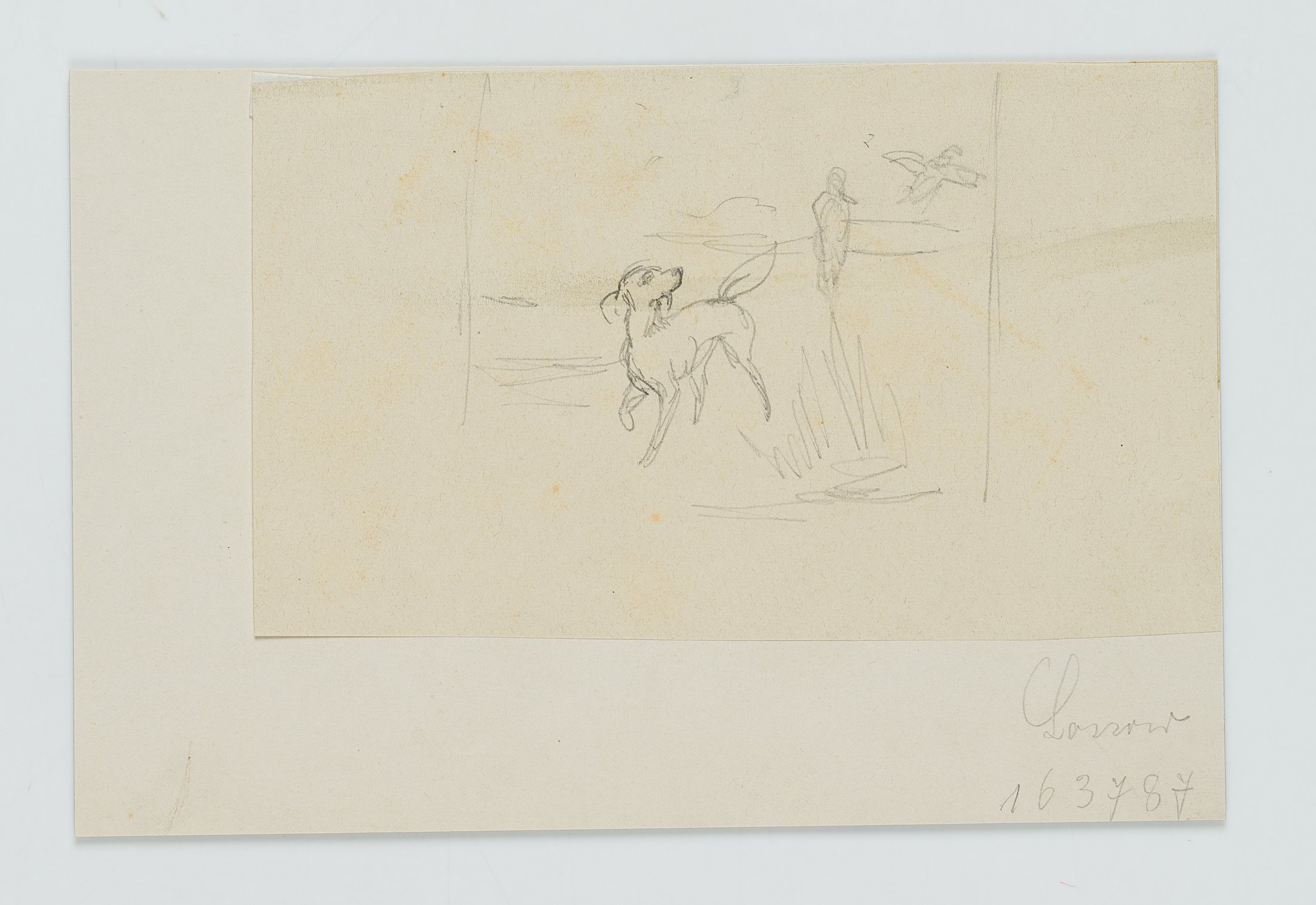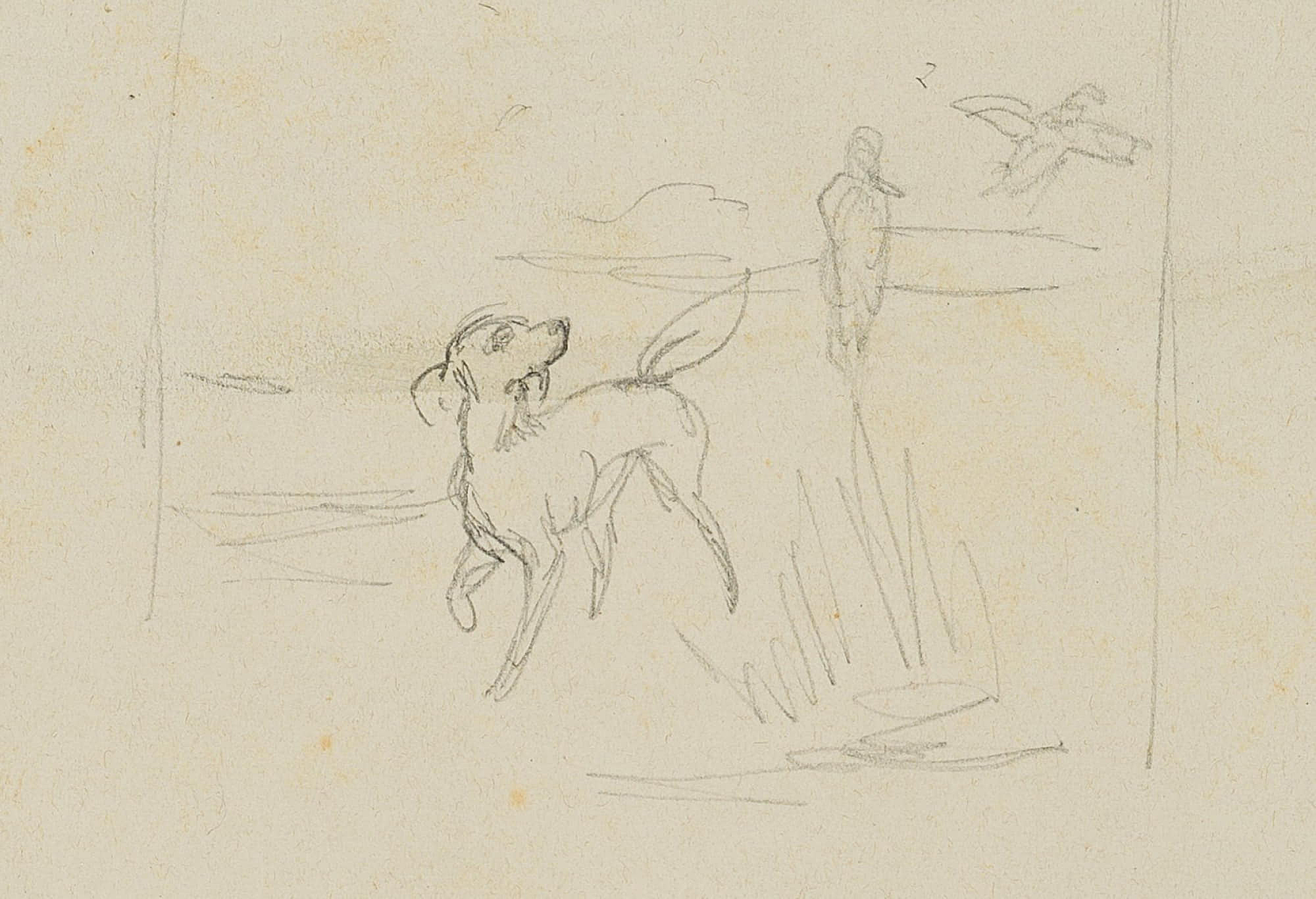 Friedrich Lossow (1837 München – 1872 ebd.), Studie, Jagdhund mit zwei Vögeln, 19. Jahrhundert, Bleistift