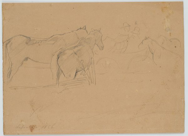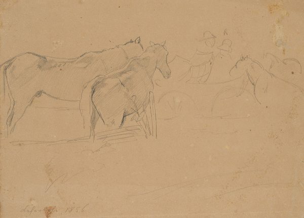Friedrich Lossow (1837 München – 1872 ebd.), Studie, Kutsche auf Pferdekoppel, 1856, Bleistift