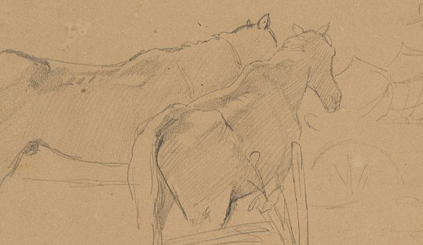 - Description: Sketch of a silent observer in a horse paddock. The horses shown from behind turn curiously towards a carriage with two passengers, which is sketched with only a few strokes.