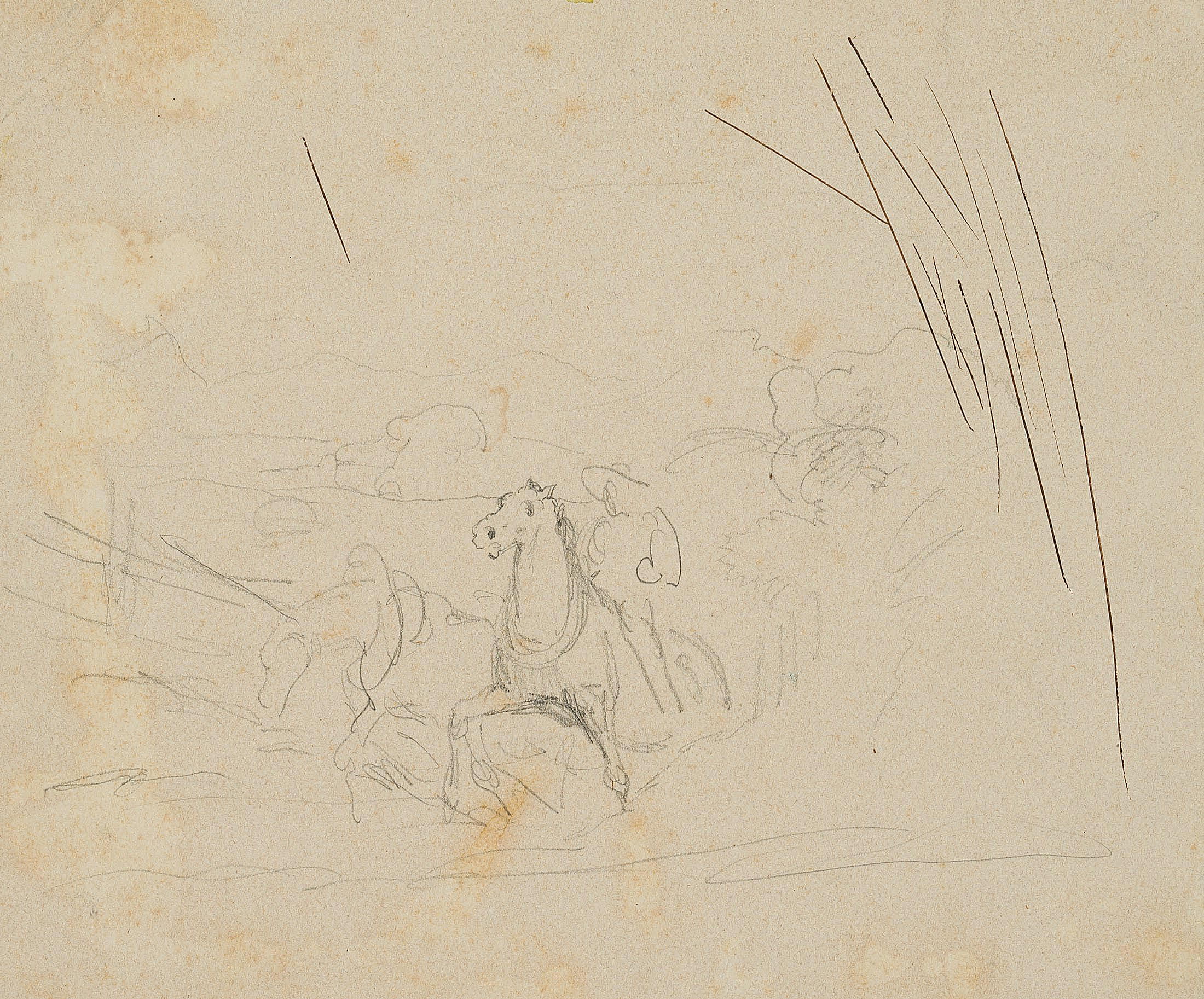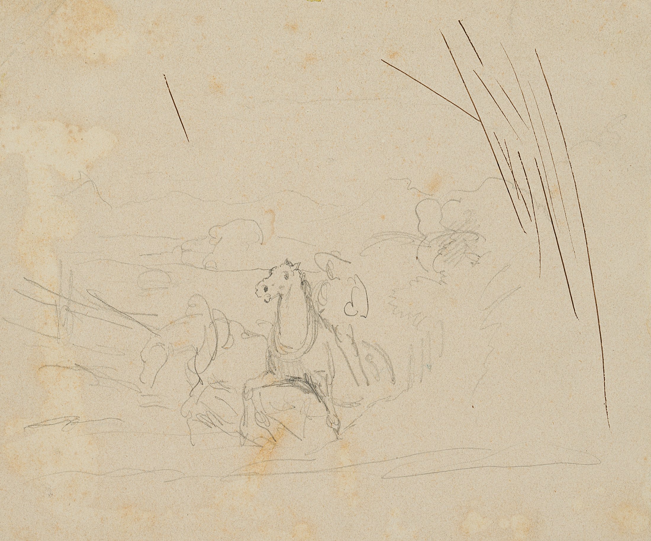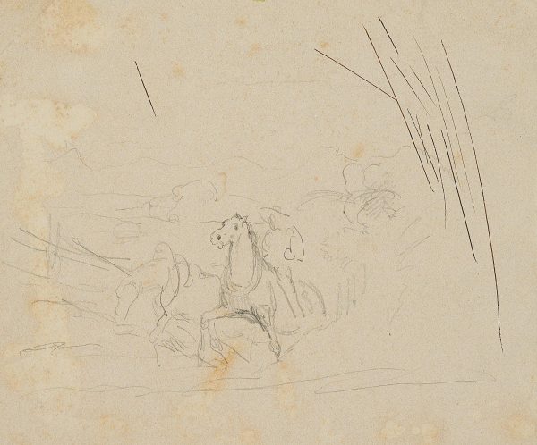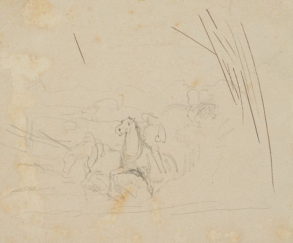 - Description: Sketch of a strenuous climb. Two horses with put on churns are bracing themselves against an invisible load, perhaps a wagon, a tree trunk or as tow horses against an attached ship. On the back of one horse a rider is indicated. On the right are some trial strokes in black ink.