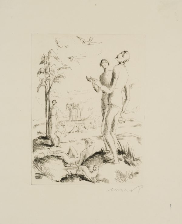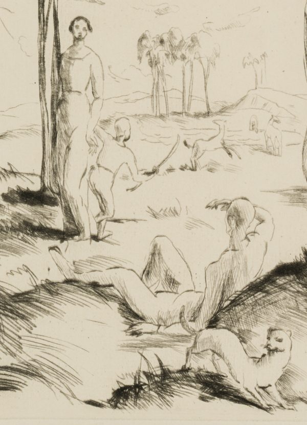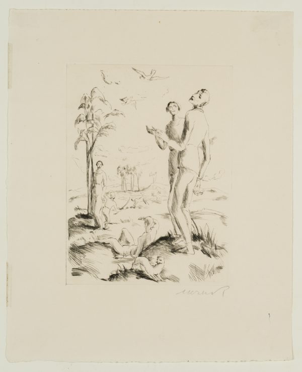 Felix Meseck (1883 Danzig – 1955 Höxter), Frieden, Idyll, Junges Paar in friedvoller Landschaft, um 1920, Radierung