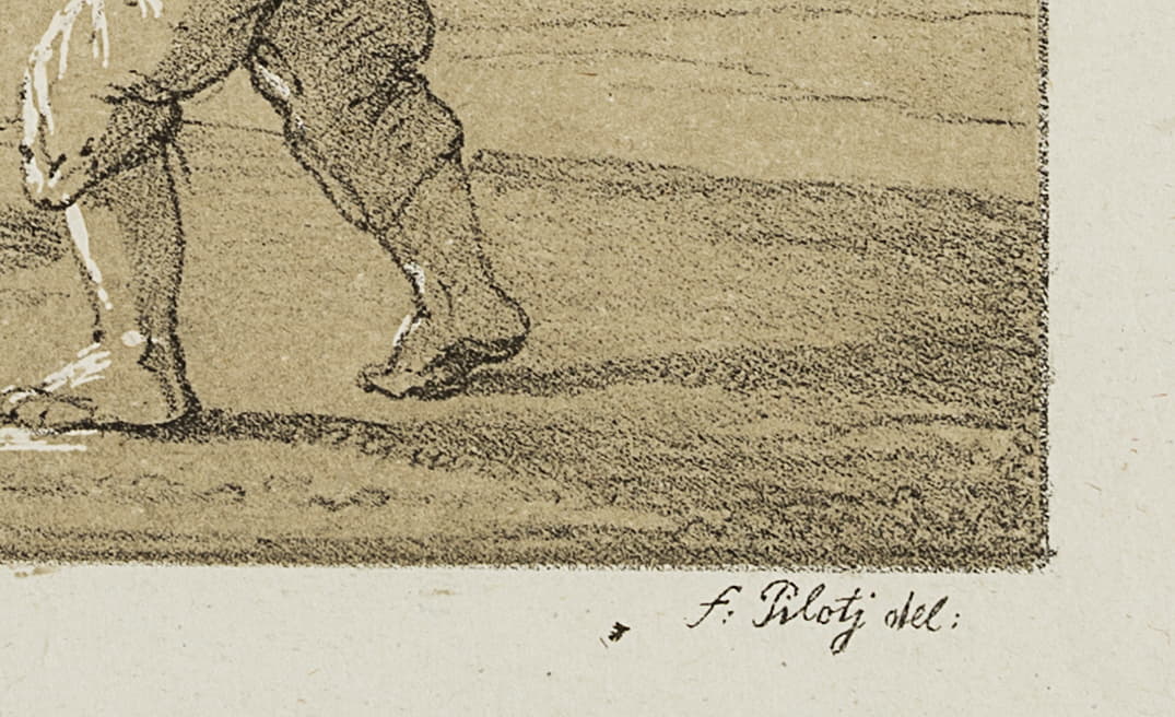 Ferdinand Piloty war ein deutscher Lithograph, der sich besonders durch die druckgraphische Reproduktion alter Handzeichnungen einen Namen gemacht hat. In München gab er zwischen 1808 und 1815 gemeinsam mit Johann Nepomuk Strixner eine umfangreiche Folge von Lithographien nach den Altmeisterzeichnungen heraus. Das vielseitige Werk hebt das ganze Können der beiden Künstler hervor, die mit einfühlsamem Blick die Zeichnungen auf den Stein kopierten und in ihren Reproduktionen einen guten Eindruck des originalen Werkes vermitteln. Charakteristisch ist vielen Blättern die Grundlage einer dezent farbigen Tonplatte mit Auskratzungen, wodurch vermutlich Weißhöhungen und unterschiedliche Papierfarben der Originale imitiert werden sollen. Piloty und Strixner nutzten die Technik der Lithographie in allen Facetten und bemühten sich stets, ihren Nachdrucken die gleiche Feinheit und Tiefe zu verleihen, die die Handzeichnungen der Alten Meister auszeichnen.