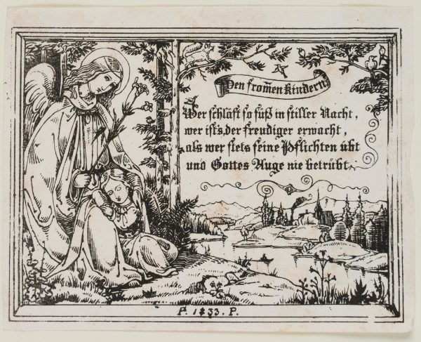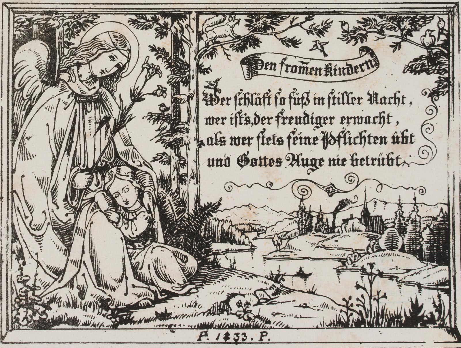 - Inscription: Titled “Den frommen Kindern” at the top. Inscribed in the image “Wer schläft so süß in stiller Nacht wer ists der freudiger erwacht”; dated and monogrammed in the lower margin “1833 FP”.