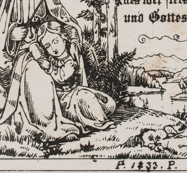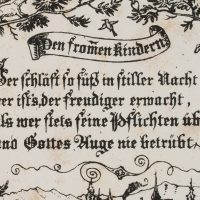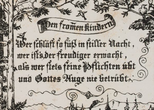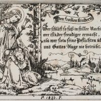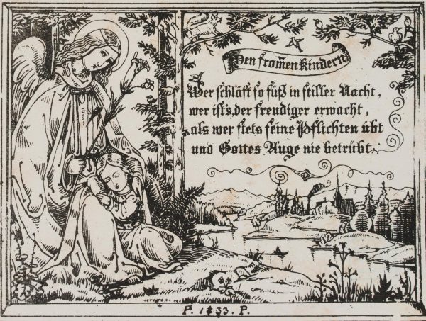 - Bezeichnung: Oben betitelt “Den frommen Kindern”. In der Darstellung bezeichnet “Wer schläft so süß in stiller Nacht wer ists der freudiger erwacht”; im unteren Rand datiert und monogrammiert “1833 FP”.