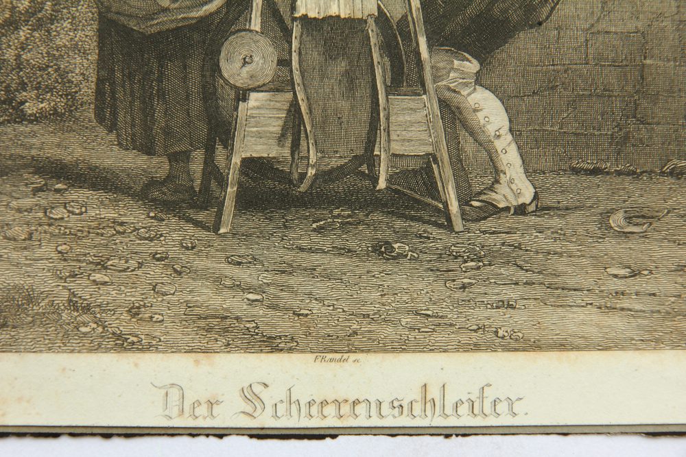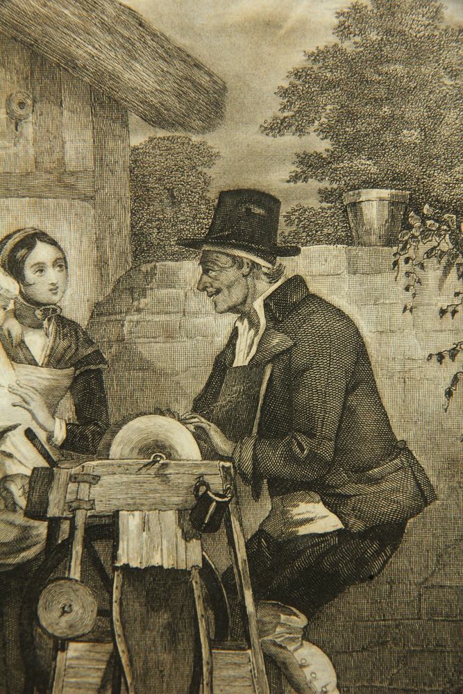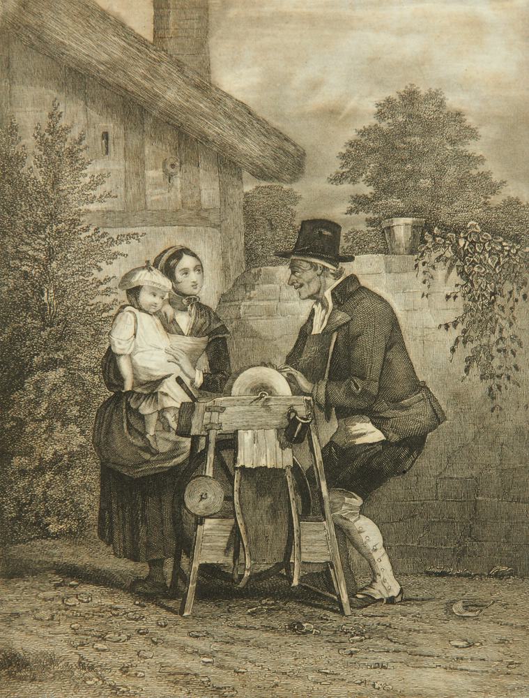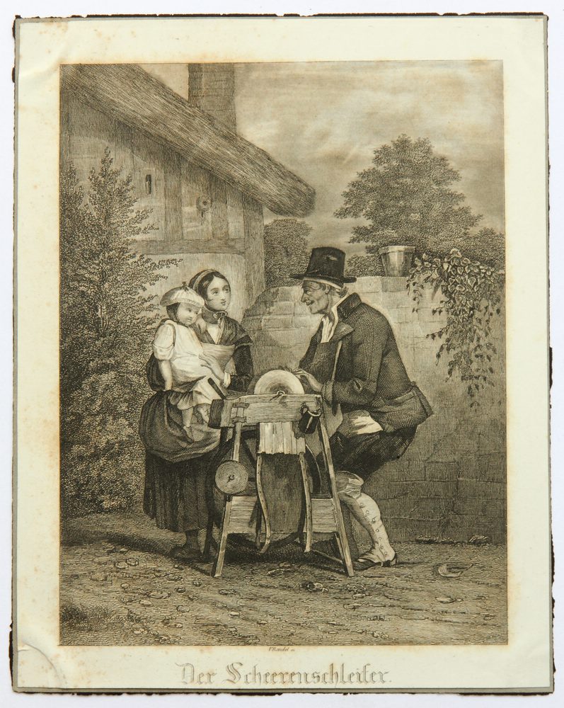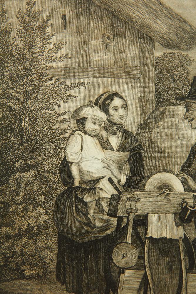 F. Randel (19. Jahrhundert), Junge Mutter mit Kind bei Scherenschleifer, 19. Jahrhundert, Stahlstich