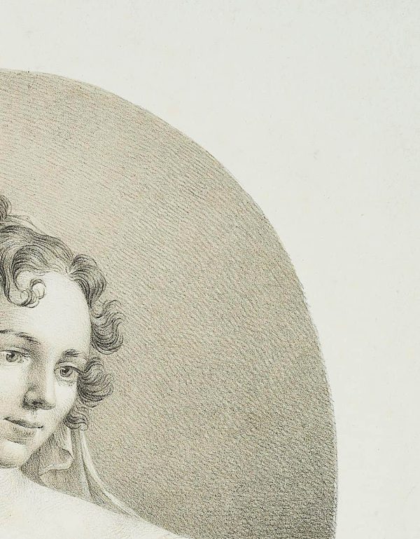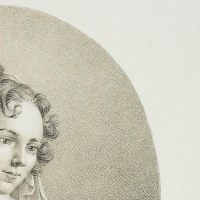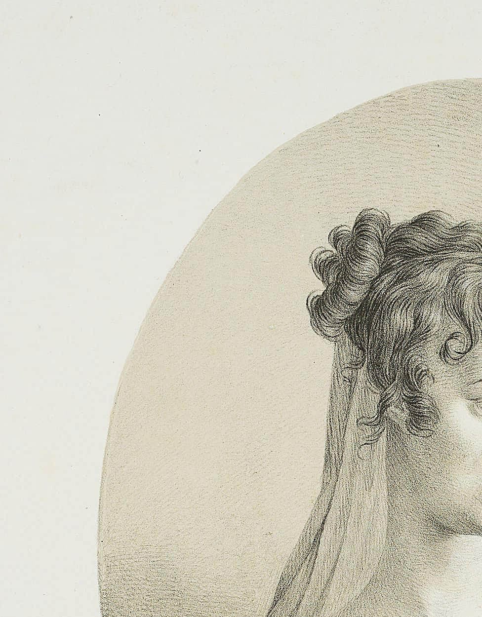 - Beschreibung: Berühmt ist der Historienmaler und Porträtist Friedrich Rehberg für seine Zeichnungen der Attitüden Lady Hamiltons, die als Druckgraphiken weite Verbreitung fanden. Die produktivsten Jahre verbrachte der Mengs-Schüler in Italien, wo er nicht nur mit von David inspirierten und in Berlin rezipierten Werken, sondern auch durch in Deutschland erschienene Kritiken zum klassizistischen Kunstdiskurs beitrug. Um 1816 kehrte er nach Berlin und München zurück und wandte sich der Lithographie zu. Möglicherweise entstand das Porträt der 1795 (nicht 1796, wie die Bildlegende besagt) geborenen Auguste Düring, die nach ihrer zweiten Heirat als Auguste Crelinger in die Theatergeschichte eingegangen ist, 1817 anlässlich ihrer Heirat mit Wilhelm Stich, der 1824 starb. Rehberg schafft jedoch kein Rollenporträt; er wählt den seit den 1780er Jahren beliebten ovalen Porträtausschnitt, um die von Iffland engagierte preußische Schauspielerin in einem Spiel zwischen Nähe und Distanz, Sinnlichkeit und Versenkung festzuhalten. Hierbei bringt die Dreiviertelansicht des Kopfes die graziöse Wirkung des Schleiers zur Geltung und erlaubt zugleich, die im Sinne der zeitgenössischen Physiognomik unwandelbaren Züge zu erfassen. Der Blick Dürings scheint eher auf einen mentalen Gegenstand, denn auf ein dialogisches Gegenüber gerichtet. Ähnlich wie Vigée-Lebrun in ihren Selbstporträts, die gleichermaßen Professionalität und weibliche Idealität betonten, verbindet Rehberg die jugendliche Schönheit der Dargestellten mit einem von Dichterporträts bekannten Blickschema.