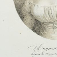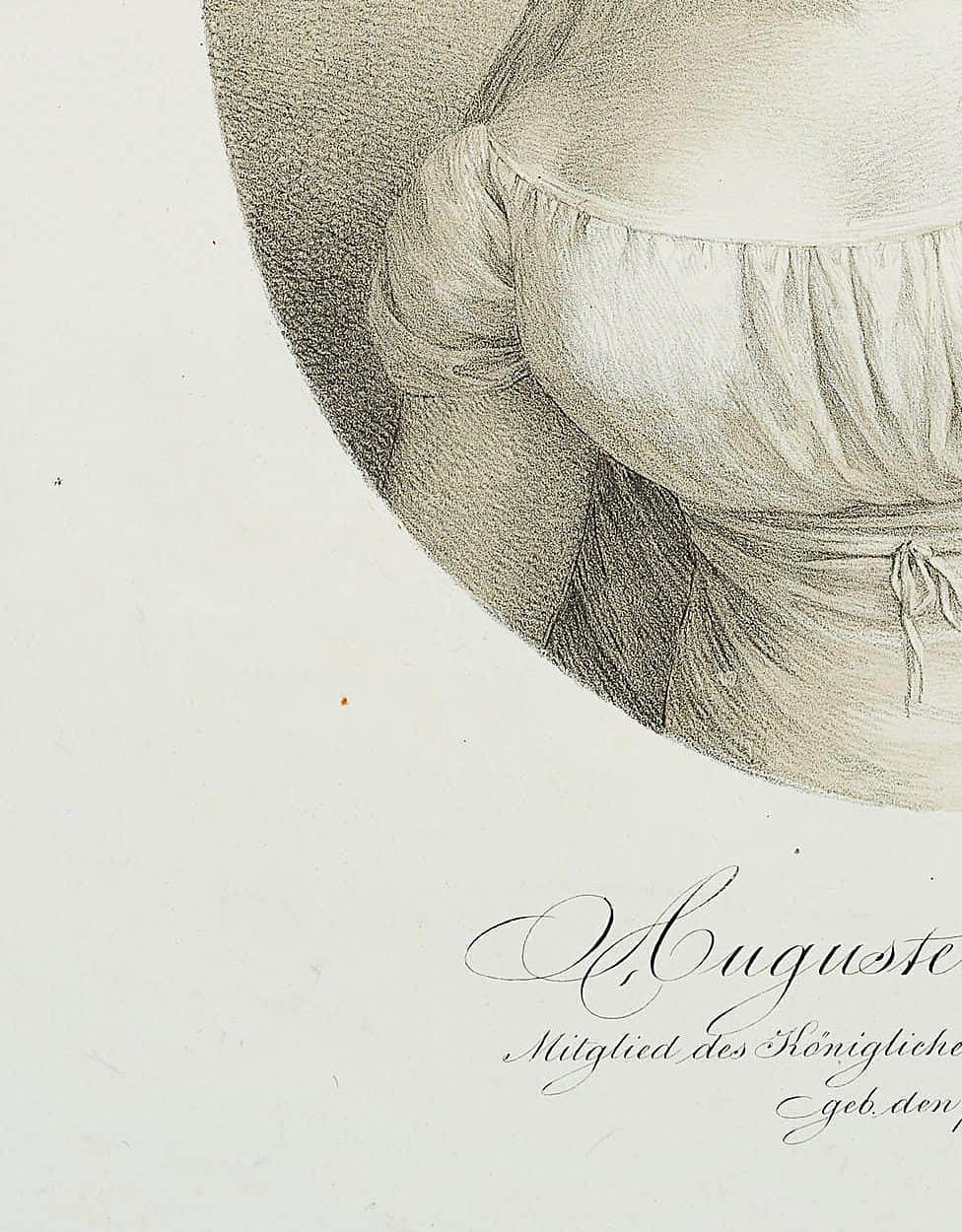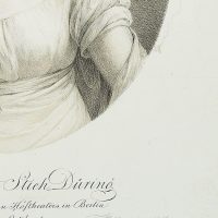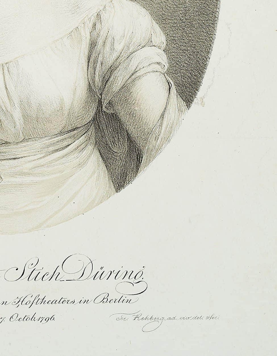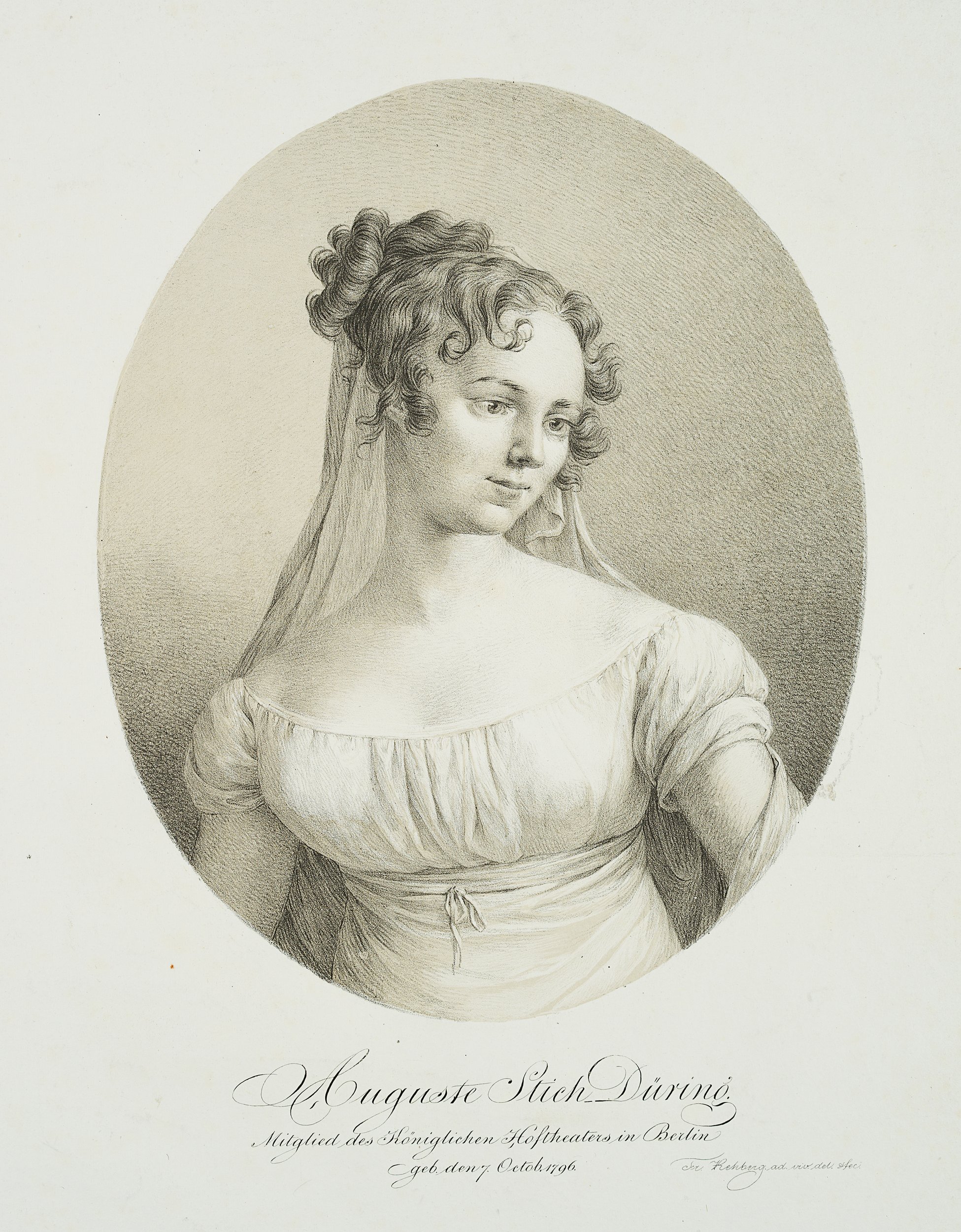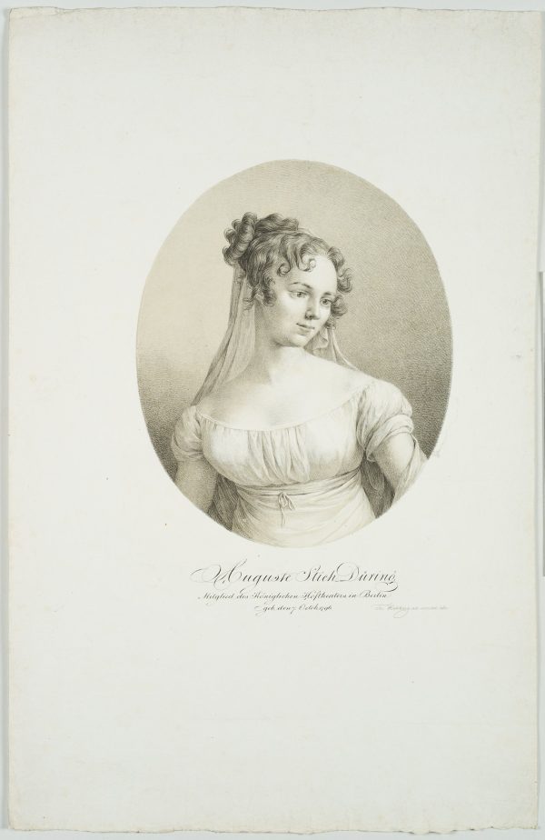 - Bezeichnung: unten bezeichnet und signiert: “Auguste Stich_Düring. Mitglied des Königlichen Hoftheaters in Berlin geb. den 7. Octob. 1796 [sic!]. Fr. Rehberg. ad. viv. del. & fec.”