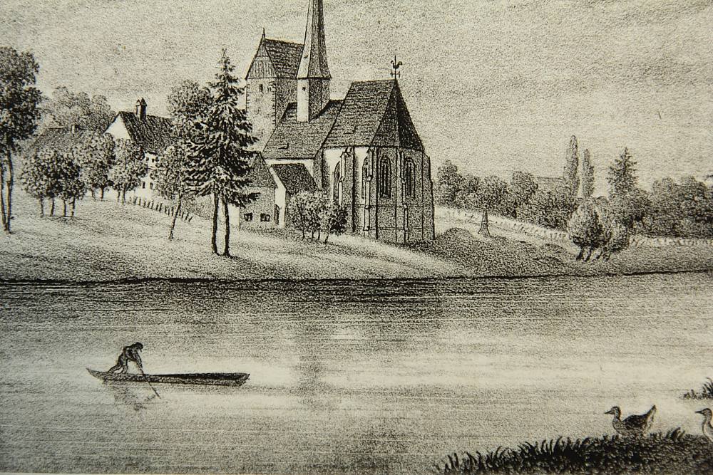 Nach einer Vorlage von W.Wegener. Mit Blick auf den Chor der Kirche am Ufer der Freiberger Mulde.