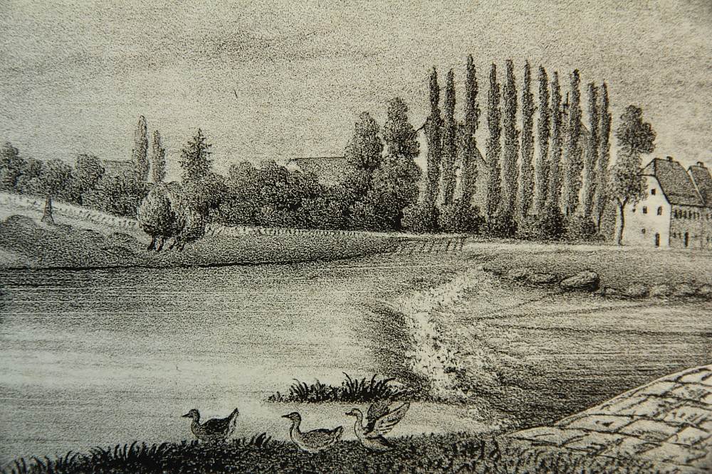 • Description: After an original by W.Wegener. With a view of the choir of the church on the bank of the Freiberg Mulde.