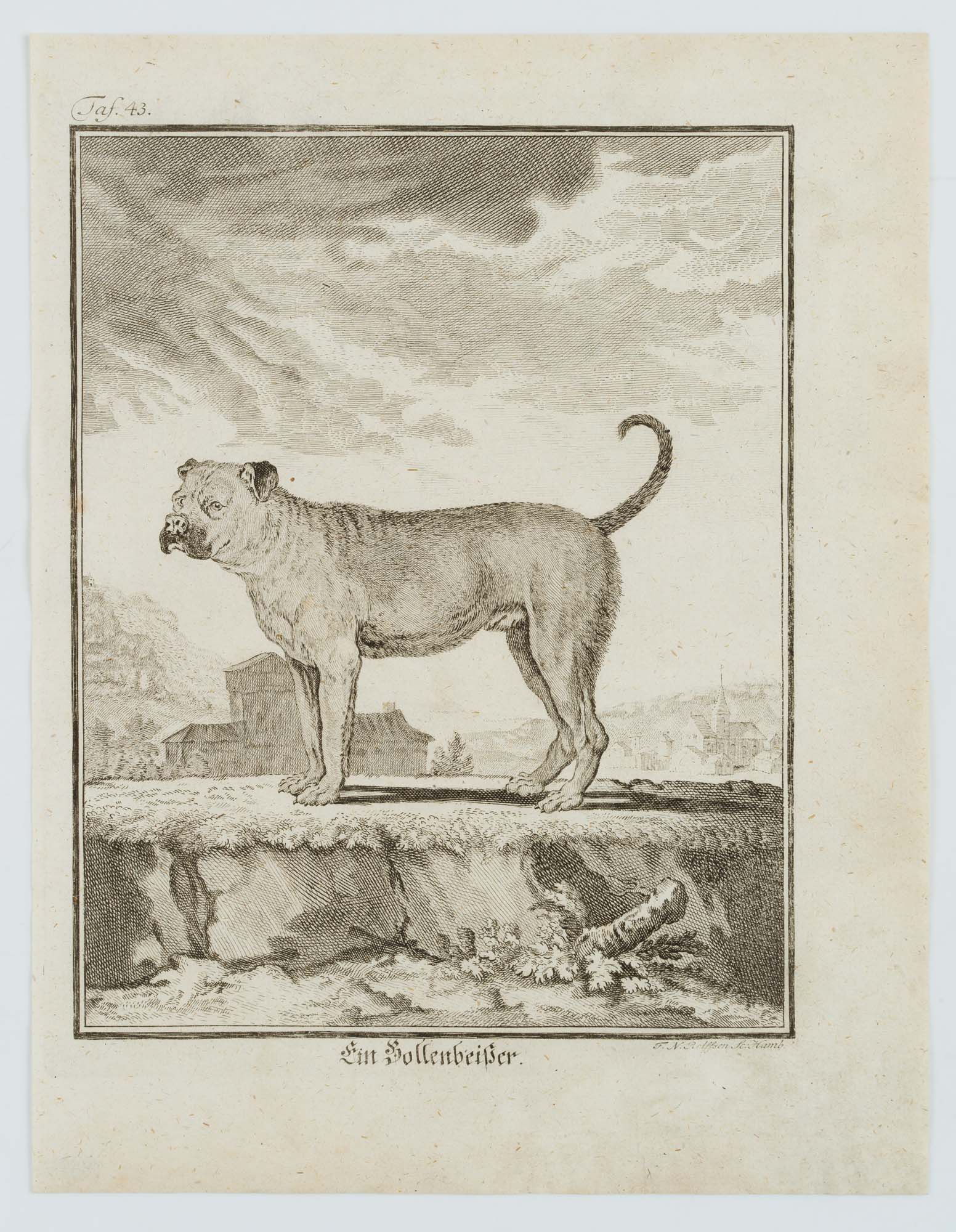 - Schlagworte: Bullenbeißer, Bärenbeißer, Dogge, Jagdhund, Sauhund, Hund, Hundeportrait, Hundedarstellung, Hunderasse, Naturkunde, Naturkundeenzyklopädie, Zoologie, Enzyklopädie, Tiere, Natur, Deutschland, Hund, Realismus, 1700-1749
