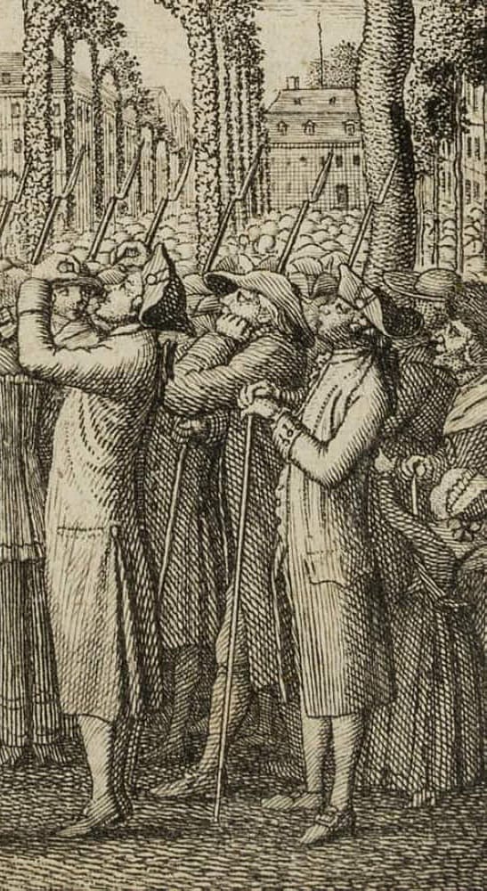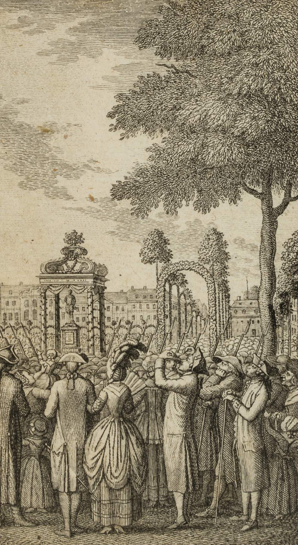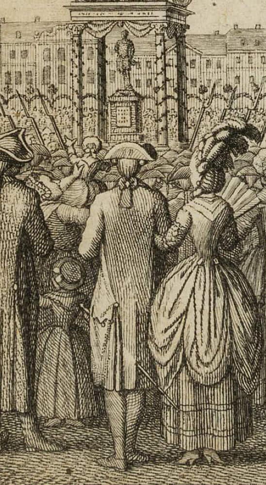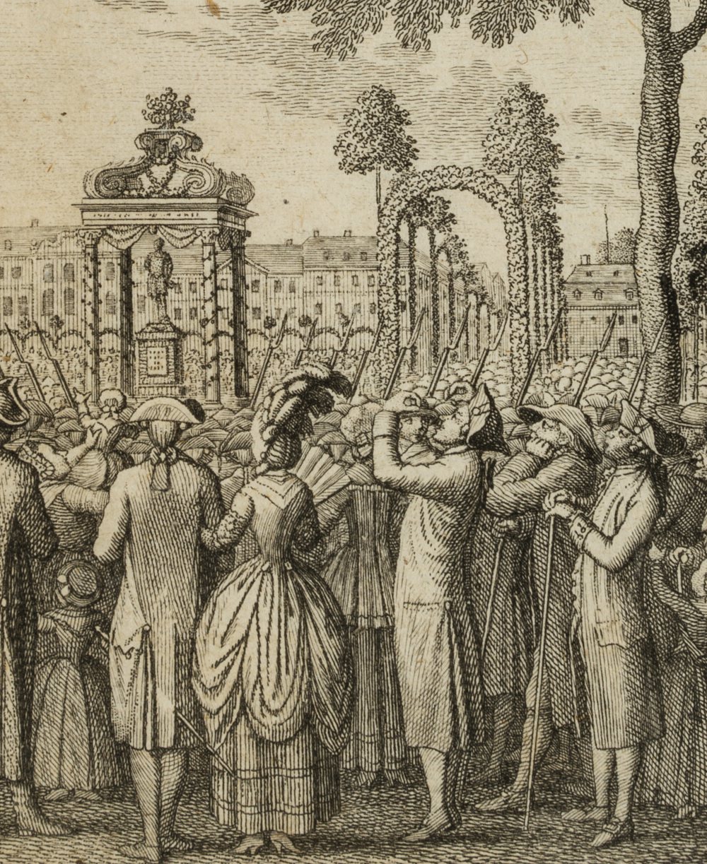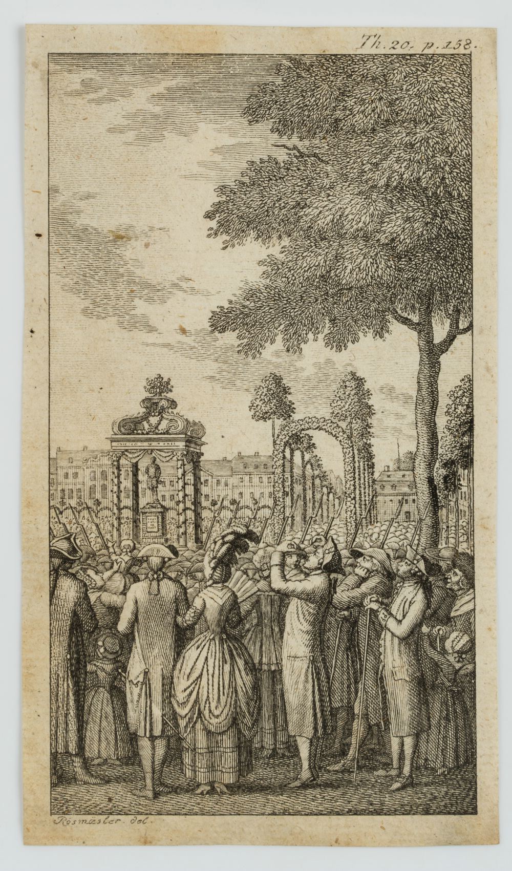 Miniaturisierte Kostümszene, vermutlich die Illustration eines literarischen Werkes des Klassizismus oder der Aufklärung. Zeigt eine Menschenmenge mit teils gelangweilten Bürgern einer vermutlich preußischen Stadt, die der Enthüllung einer Statue auf einem großen Platz beiwohnt.