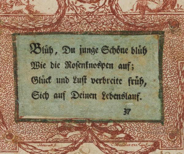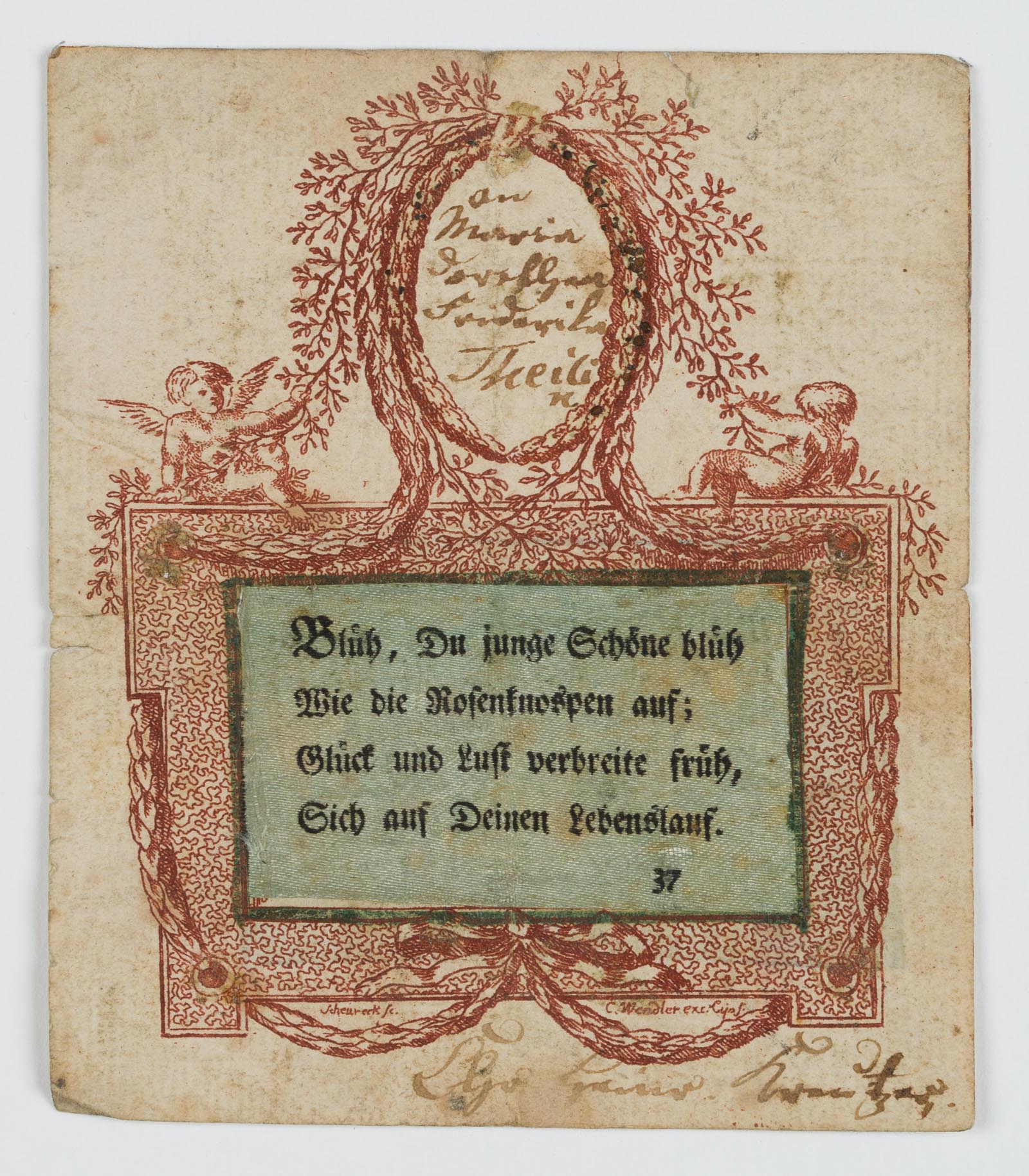 - Description: On paper with glitter appliqués. Congratulatory verses printed on fabric. “Blueh, Du junge Schöne blueh, Wie die Rosenknospen auf; Glück und Lust verbreite frueh, sich auf deinem Lebenslauf.” Underneath the number 37.