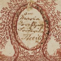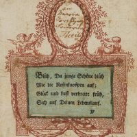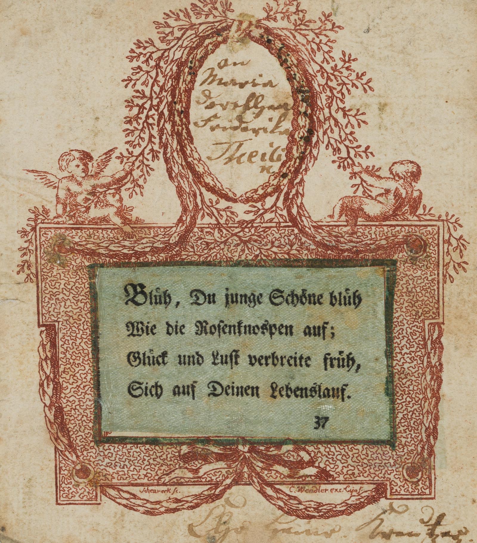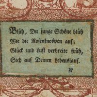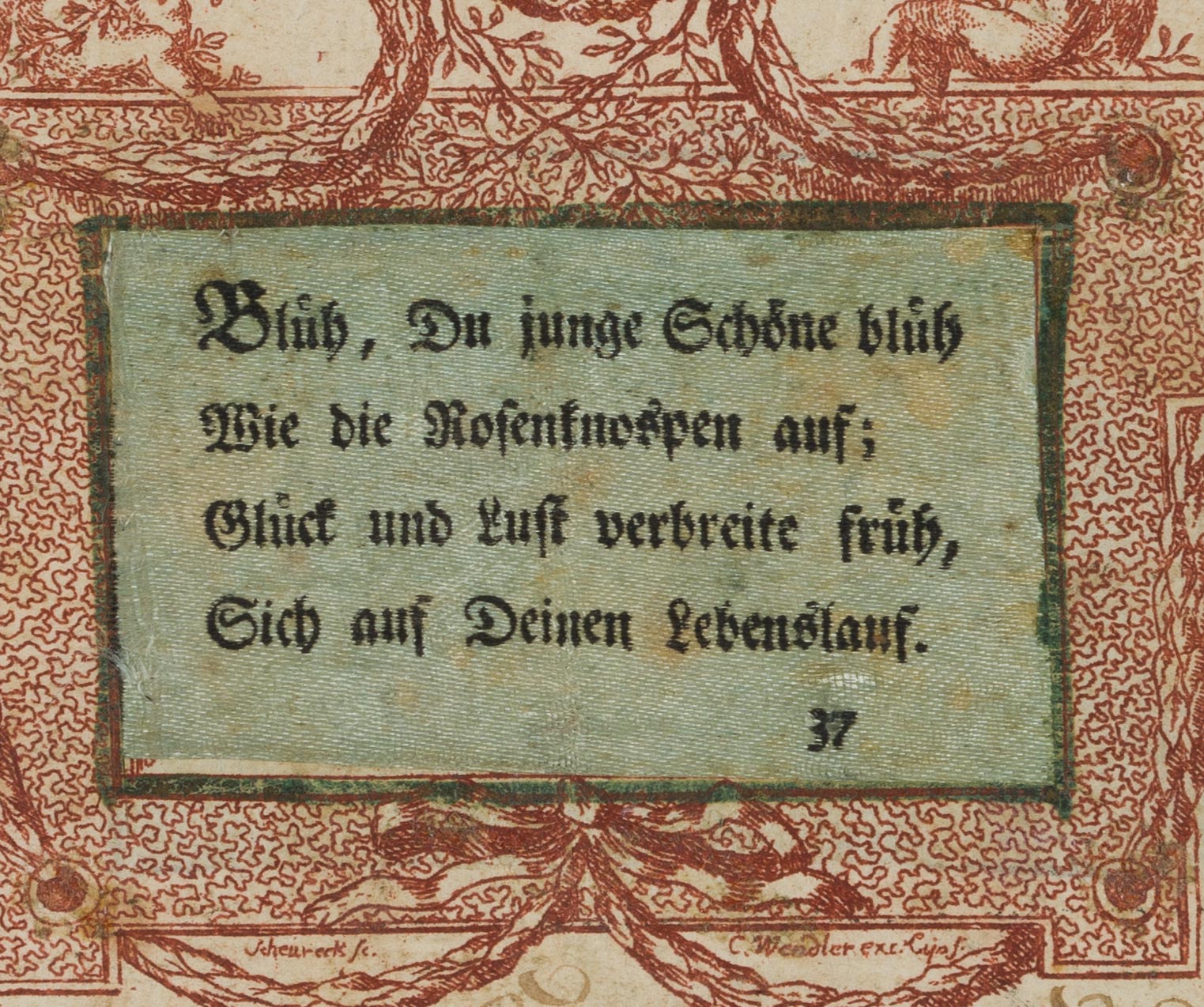 - Beschreibung: Auf dem Papier mit Glitzerapplikationen. Auf Stoff gedruckte Glückwunschverse. “Blueh, Du junge Schöne blueh, Wie die Rosenknospen auf; Glück und Lust verbreite frueh, sich auf deinem Lebenslauf.” Darunter die Nummer 37.