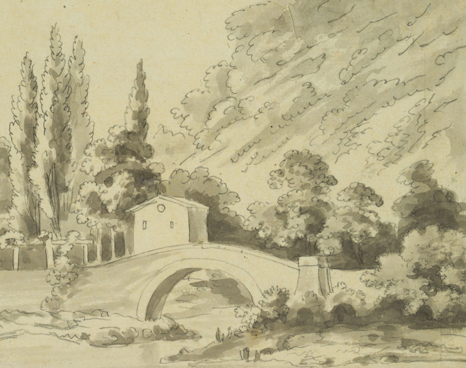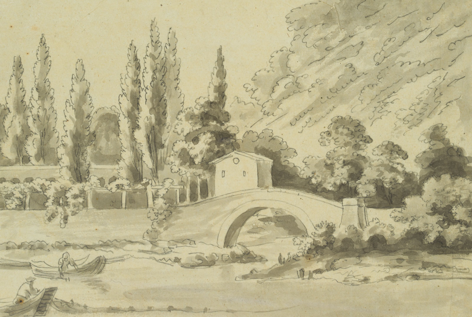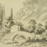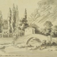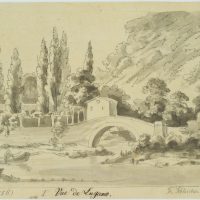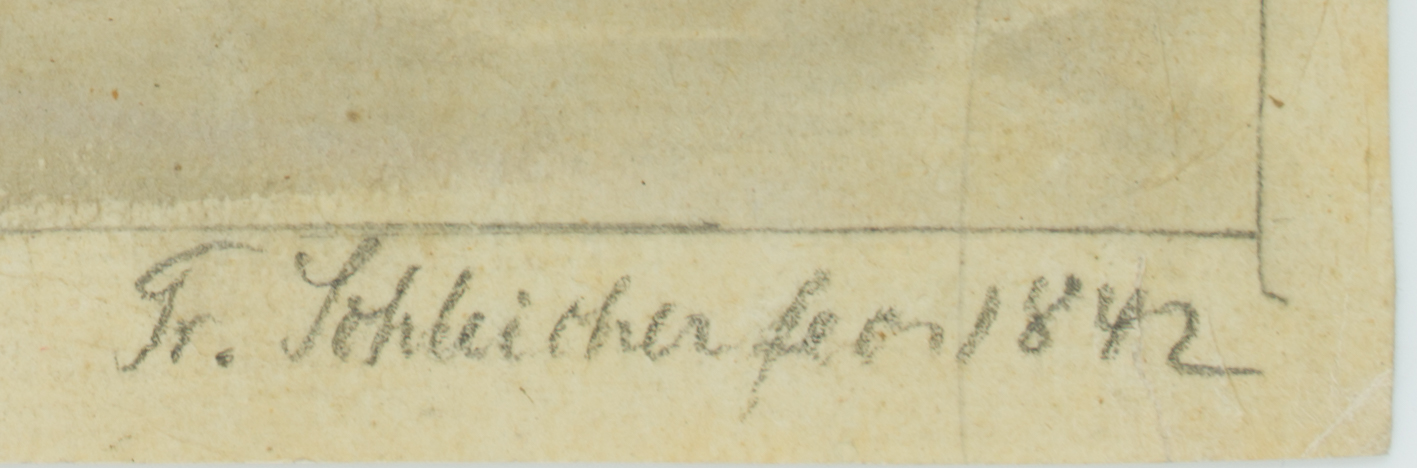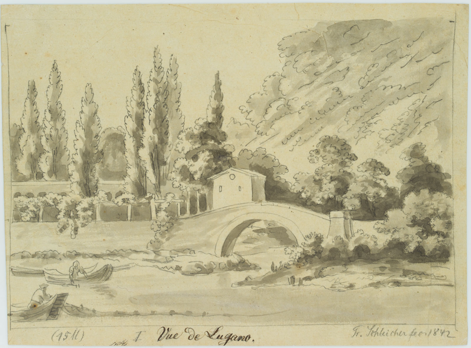 - Beschreibung: Bezeichnet unten rechts unterhalb der Darstellung “Fr. Schleicher 1842”, benannt “Vue de Lugano”. Vom Wasser aus blicken die Betrachtenden auf eine kleine steinerne Brücke, die womöglich die Mündung des Flusses Cassarate in den Luganersee überspannt. Dahinter sind zahlreiche Bäume und ein bewaldeter Hang zu sehen, dazwischen ein kleines Haus. Im Vordergrund sind zwei kleine Holzboote zu sehen, auf denen Fischer bei ihrer Arbeit dargestellt sind.