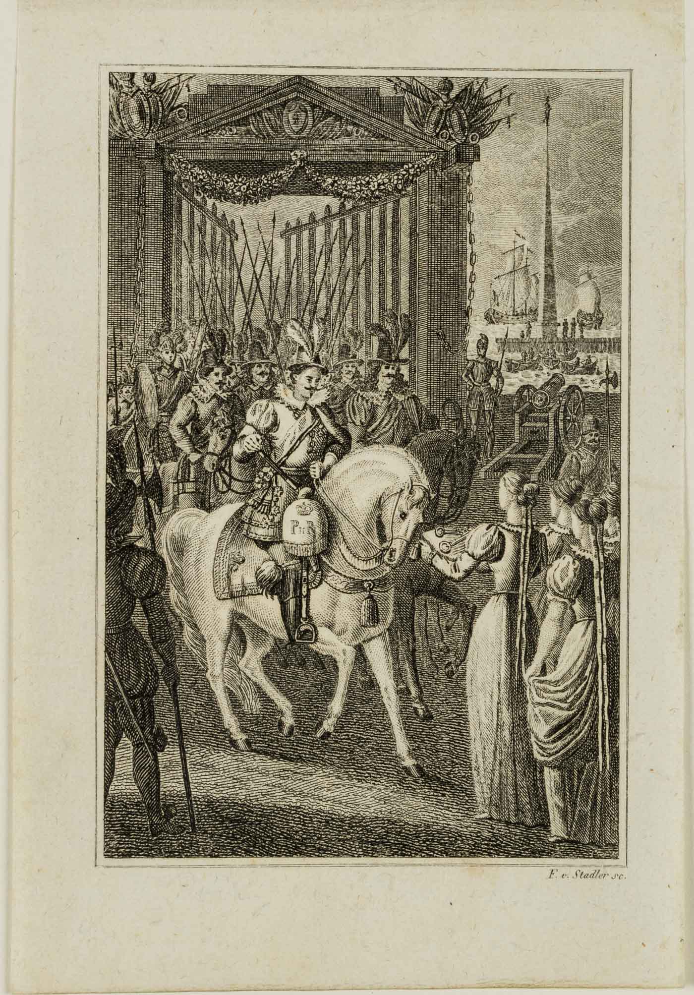 - Description: The depiction shows a troop of horsemen in military uniform who have just passed through an open gate. In the foreground a woman hands them two large keys. The background shows the scene as a harbour area, there are isolated smaller boats to be seen, an obelisk stands on the shore of the harbour. In the background are two large sailing ships.