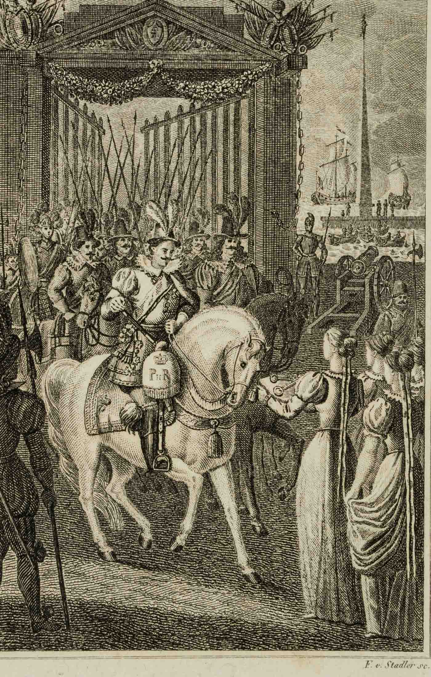 - Beschreibung: Die Darstellung zeigt eine Truppe von Reitern in militärischer Uniform, die soeben durch ein geöffnetes Tor gelangt sind. Im Vordergrund überreicht eine Frau ihnen zwei große Schlüssel. Der Hintergrund lässt die Szenerie als Hafengebiet erkennen, dort sind vereinzelt kleinere Boote zu sehen, ein Obelisk steht am Ufer des Hafens. Im Hintergrund zwei große Segelschiffe.