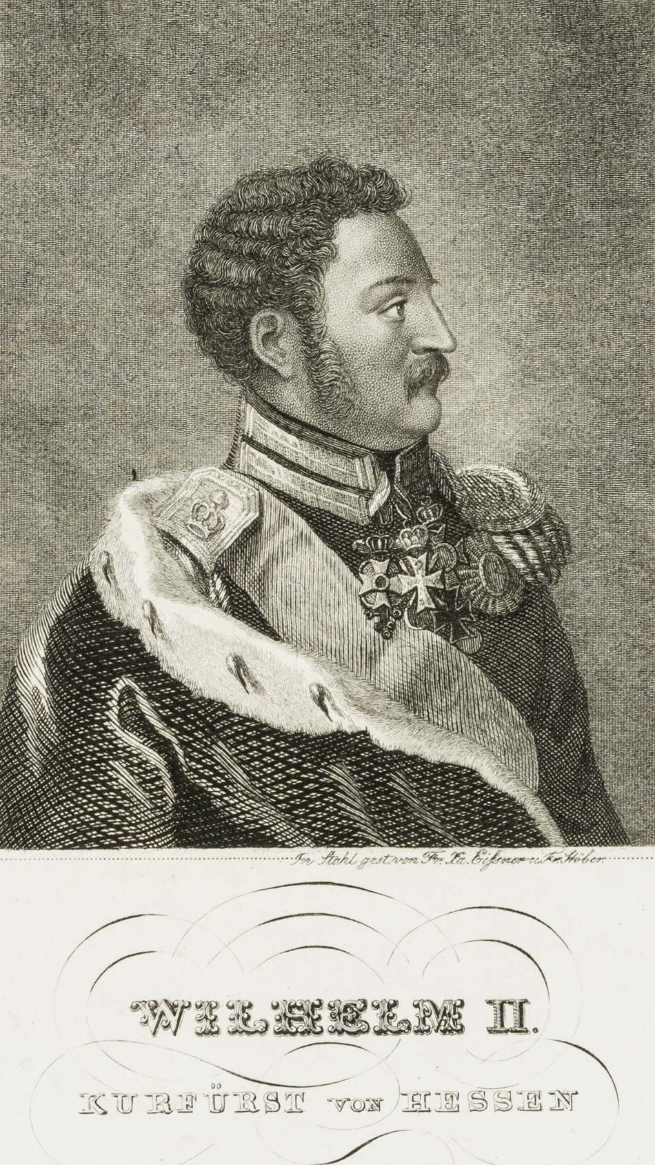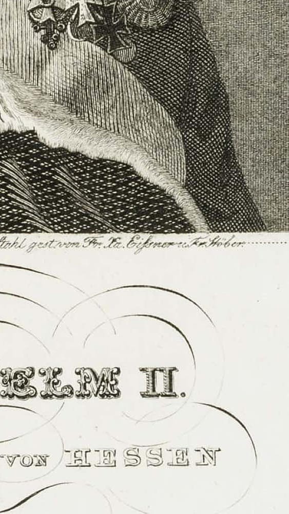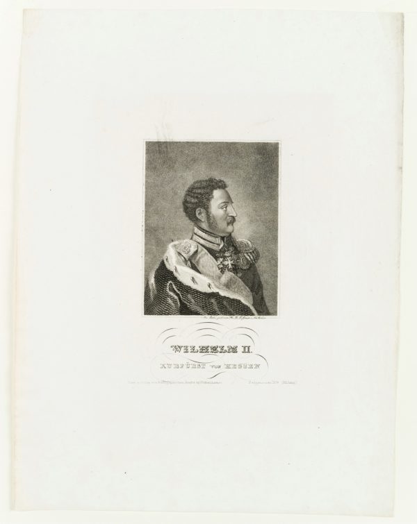 - Description: Signed on the right below the picture “In Stahl gestochen von Fr. Eissner and Fr. Stöber”. Inscribed below with the sitter’s name “WILHELM II. KURFÜRST VON HESSEN” inscribed below.