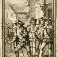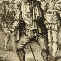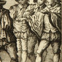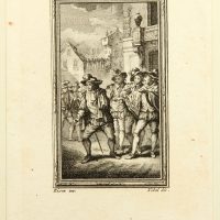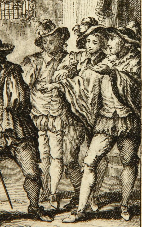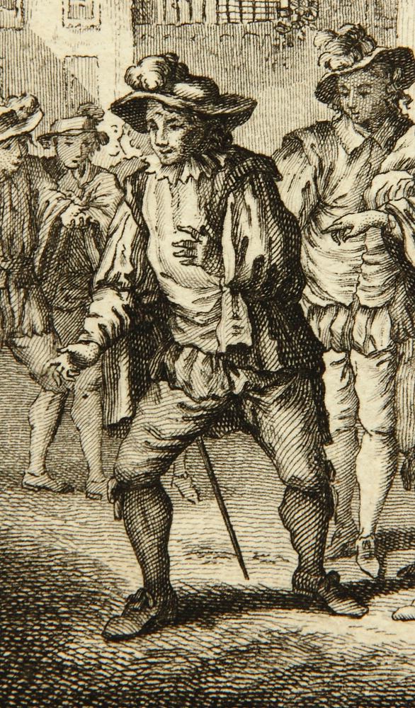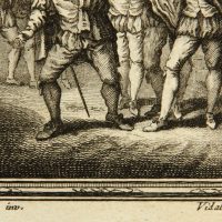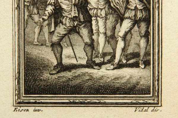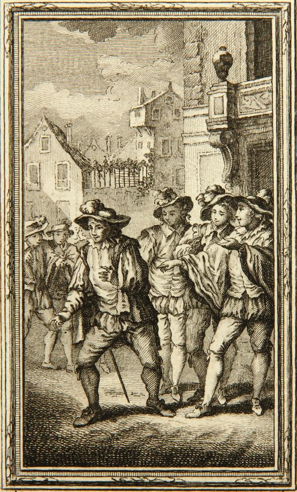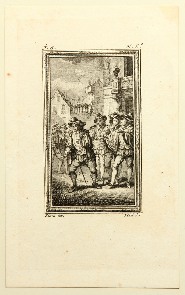 - Beschreibung: Nach einer Vorlage von “Eisen”. Ganzfigurige Darstellung einer Gruppe junger Männer mit Federhüten und edler Kleidung vor einer Hausfassade. Im Hintergrund sind Wohngebäude einer Stadt zu sehen. Oberhalb des fingierten Rahmens befinden sich in der Druckplatte die Nummerierungen “j. 6.” und “N. 6e.”.