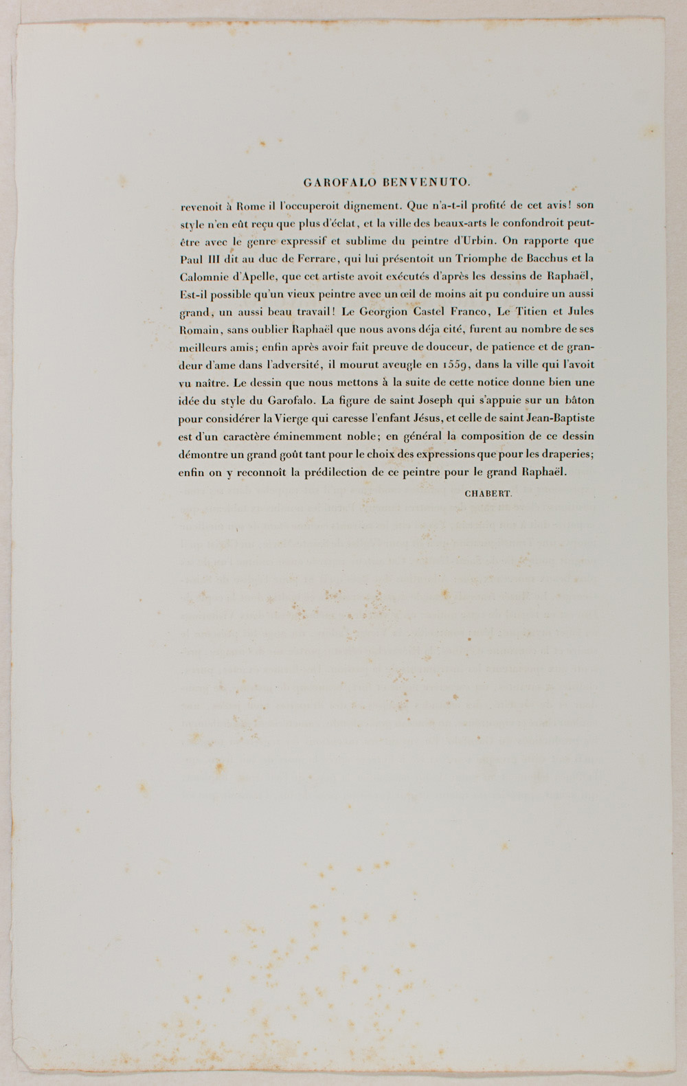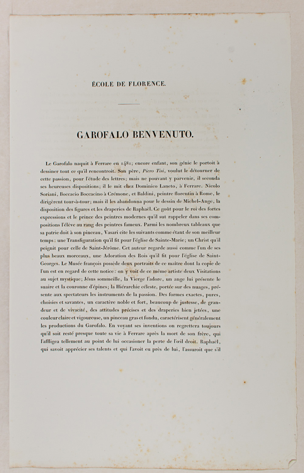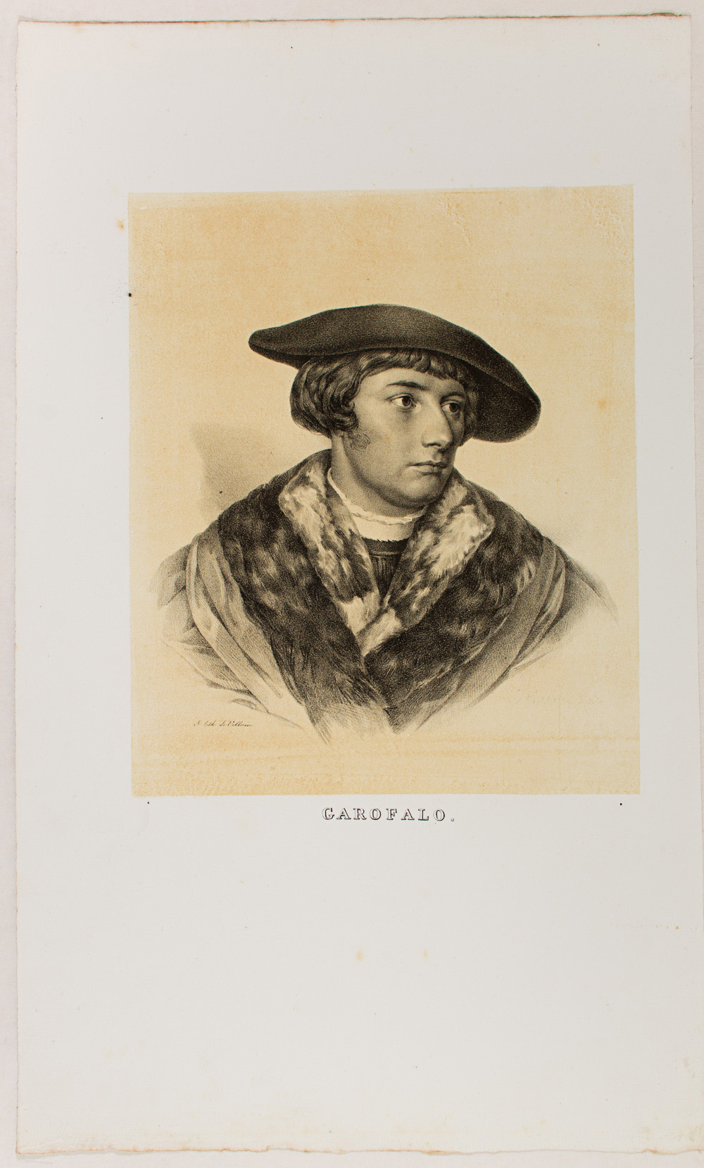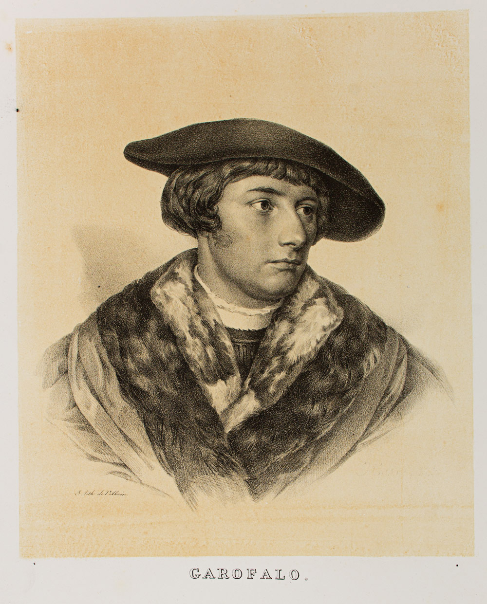 - Description: Portrait: GAROFALO. Benvenuto Tisi Garofalo, also II Garofalo (1481-1559), painter of the Romanesque School. Colour lithograph. Inscribed: J. lith. de Villain. Stamp in the lower left half of the sheet. ,,Separate text information In French by Chabert). Embossed stamp in the lower part of the sheet. From the time around 1830.