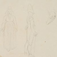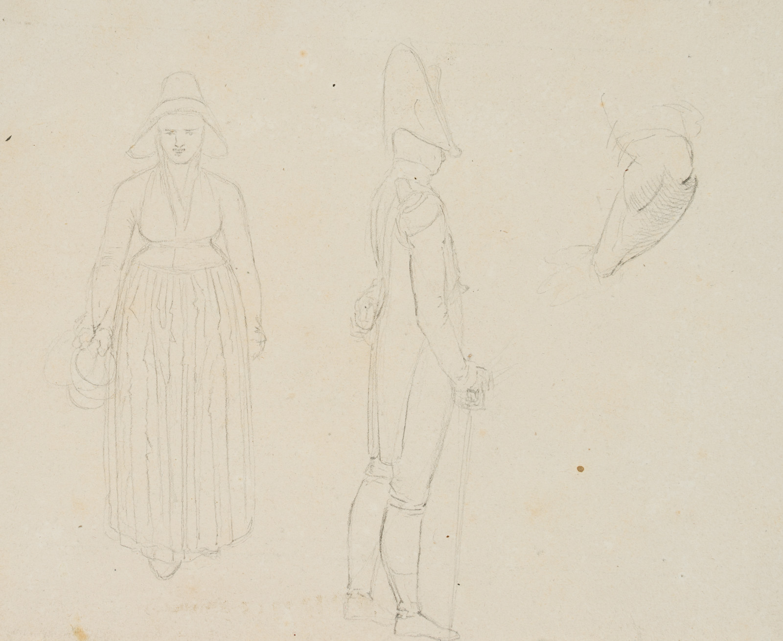 - Description: Signed “Voltz” above the image; sketches of a peasant woman and a soldier on the verso.