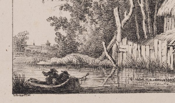 Franz Edmund Weirotter (1733 Innsbruck – 1771 Wien), Hütte eines Fischers am Fluss, Landschaft mit Fischerboot, 18. Jahrhundert, Lithographie