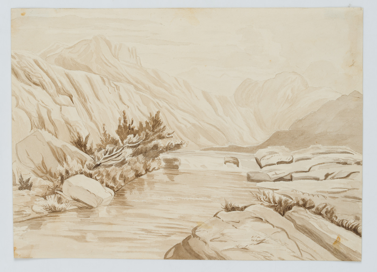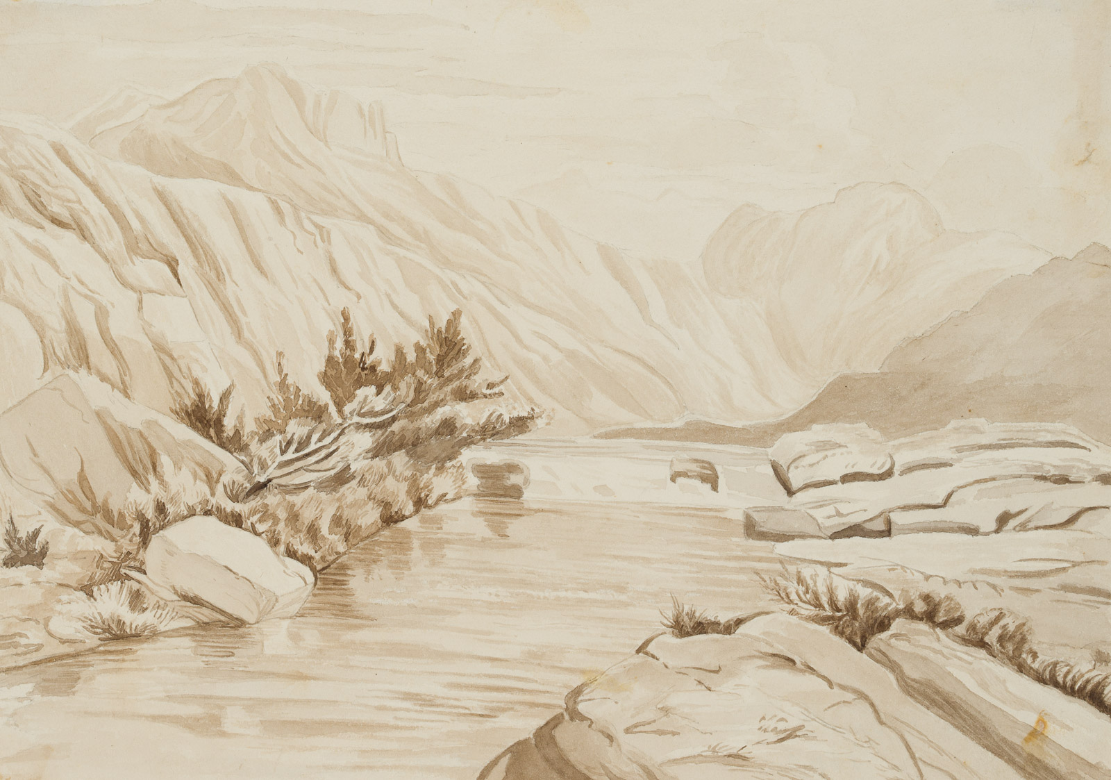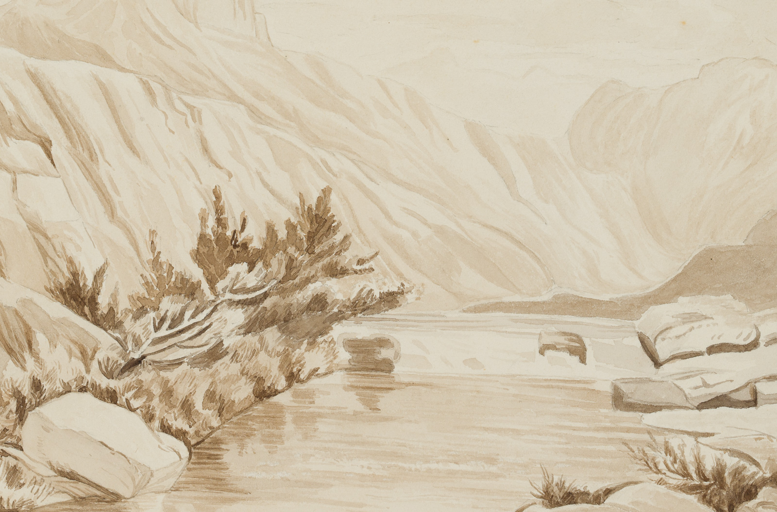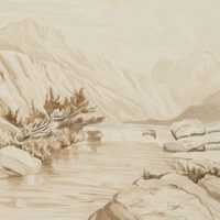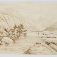 Friedrich Wilhelm Zimmermann (1826 Gornewitz – 1887 München), Gebirgslandschaft mit Fluß, 1863, Aquarell