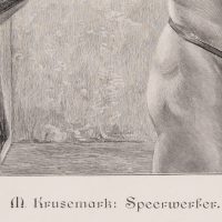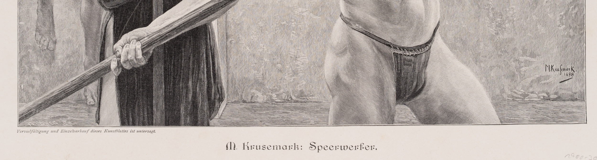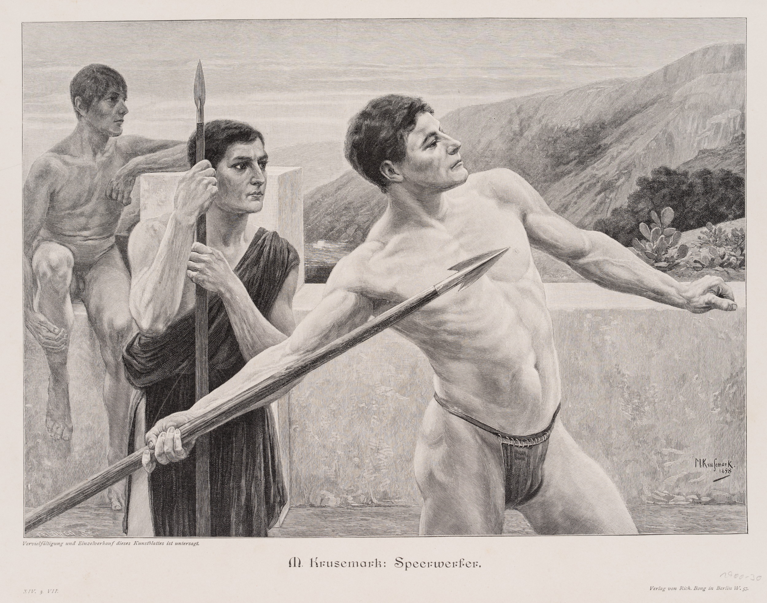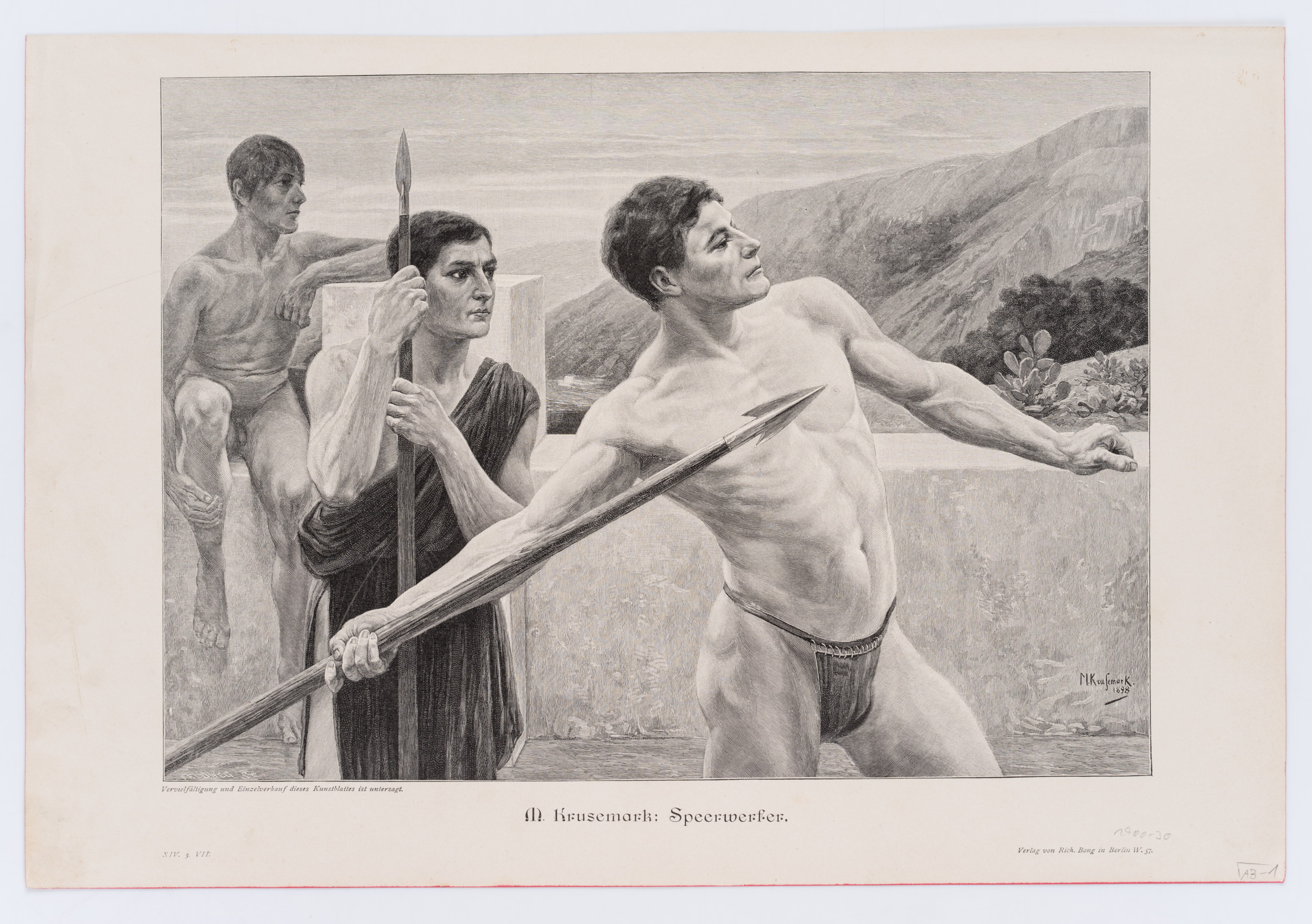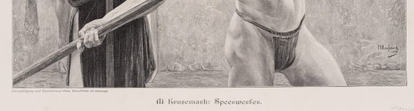 - Inscription: At the lower part inscribed in the printing plate: “Vervielfältigung und Einzelverkauf dieses Kunstblattes ist untersagt | M. Krusemark: Speerwerfer | Verlag von Rich. Bong in Berlin W. 57.”.
