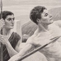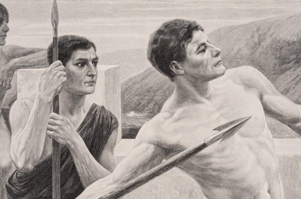 - Beschreibung: Kunstblatt mit Darstellung eines athletischen Speerwerfers in historisierender Umgebung.