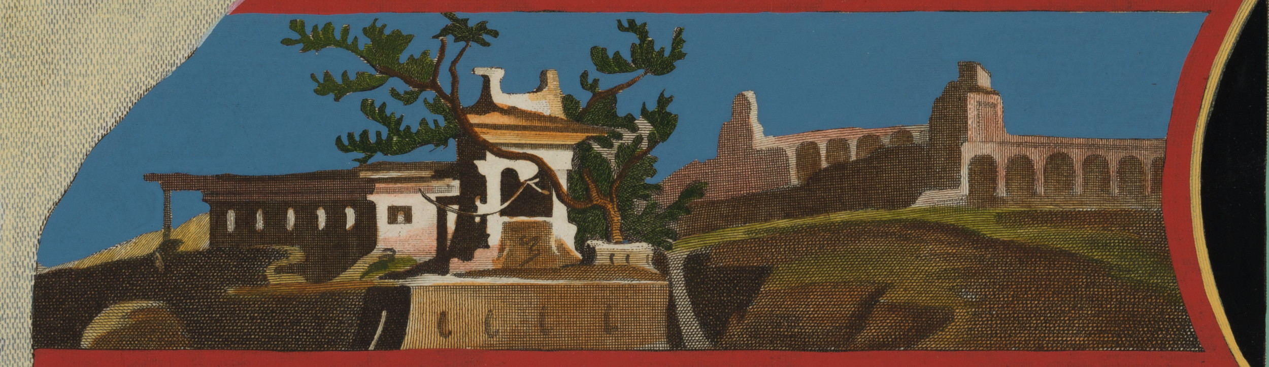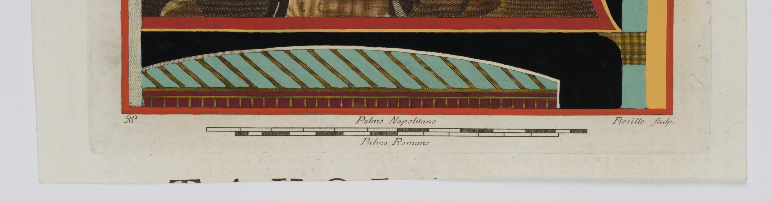 - Description: After the frescoes from the excavation sites of Herculaneum and Pompeii. By ending the edges of the engraving irregularly and with missing parts, the depiction reflects the fragmented state of the fresco.