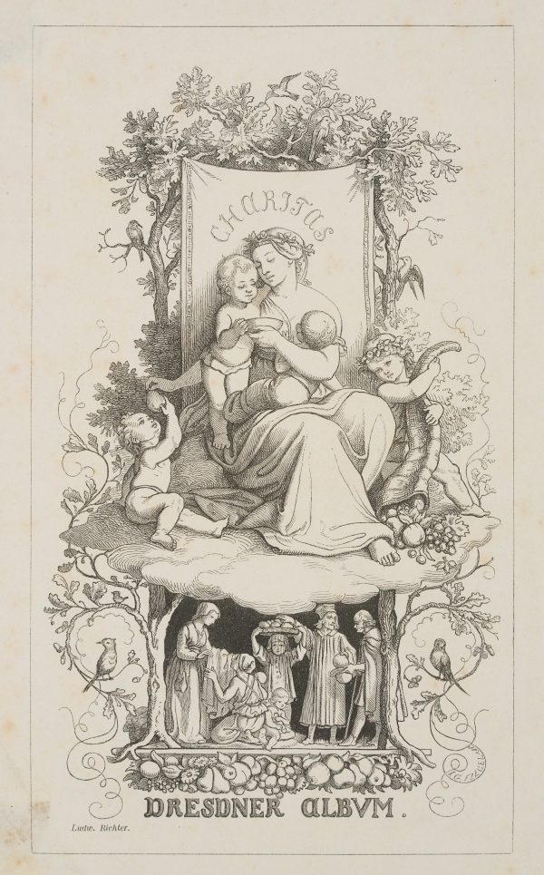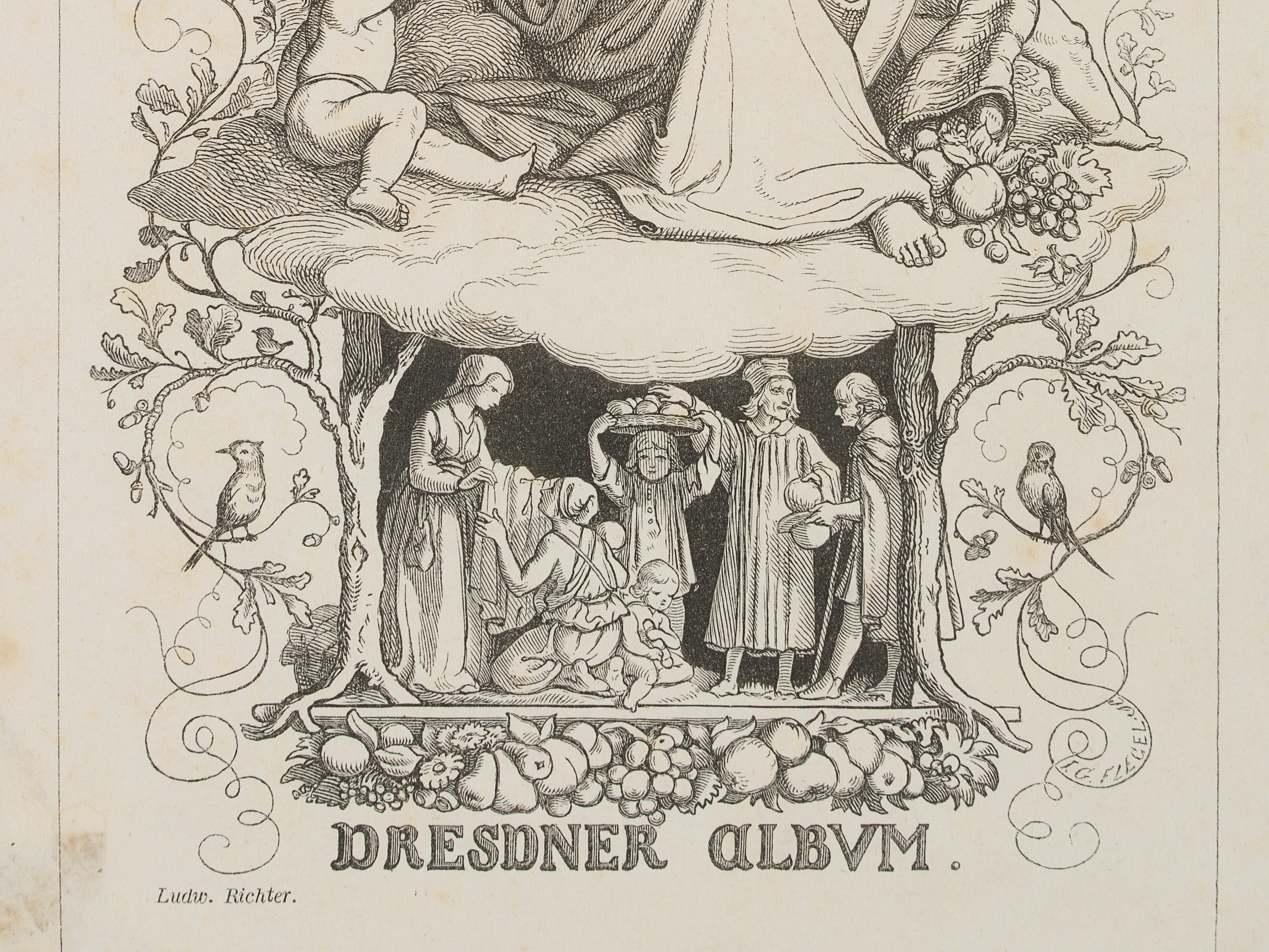 Johann Gottfried Flegel (1815 Leipzig – 1881 ebd.) nach Ludwig Richter (1803 Dresden – 1884 ebd.), Titelblatt zu Dresdner Album. Zur Unterstützung der Nothleidenden im sächsischen Erzgebirge, im Voigtlande und in den Weberdörfern der Oberlausitz, Probedruck, 1847, Holzstich