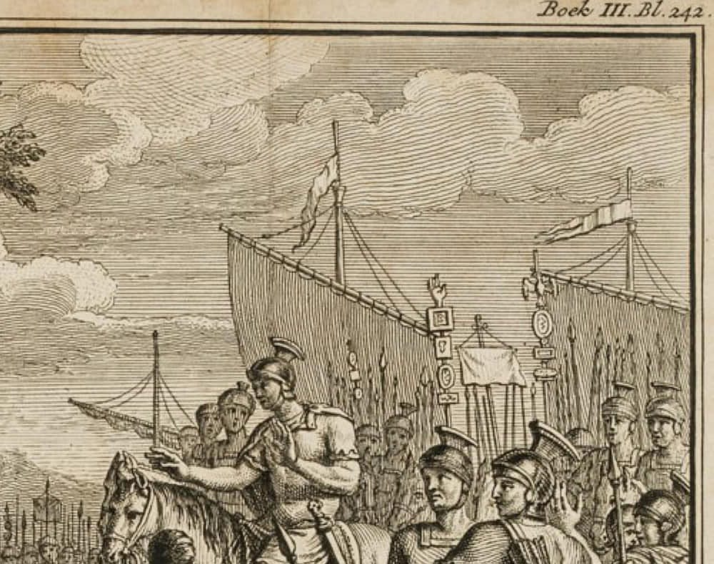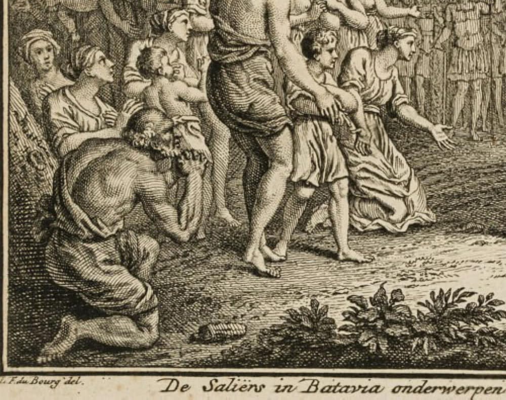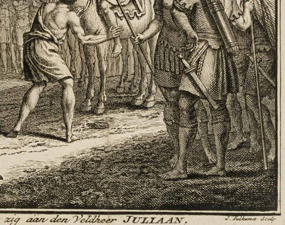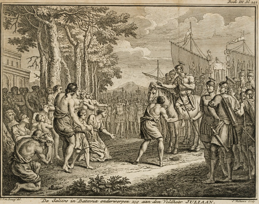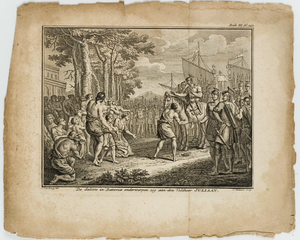 - Beschreibung: Darstellung unterhalb betitelt mit: “De Saliers in Batavia onderwerpen zig aan den Veldheer JULIAN.”.