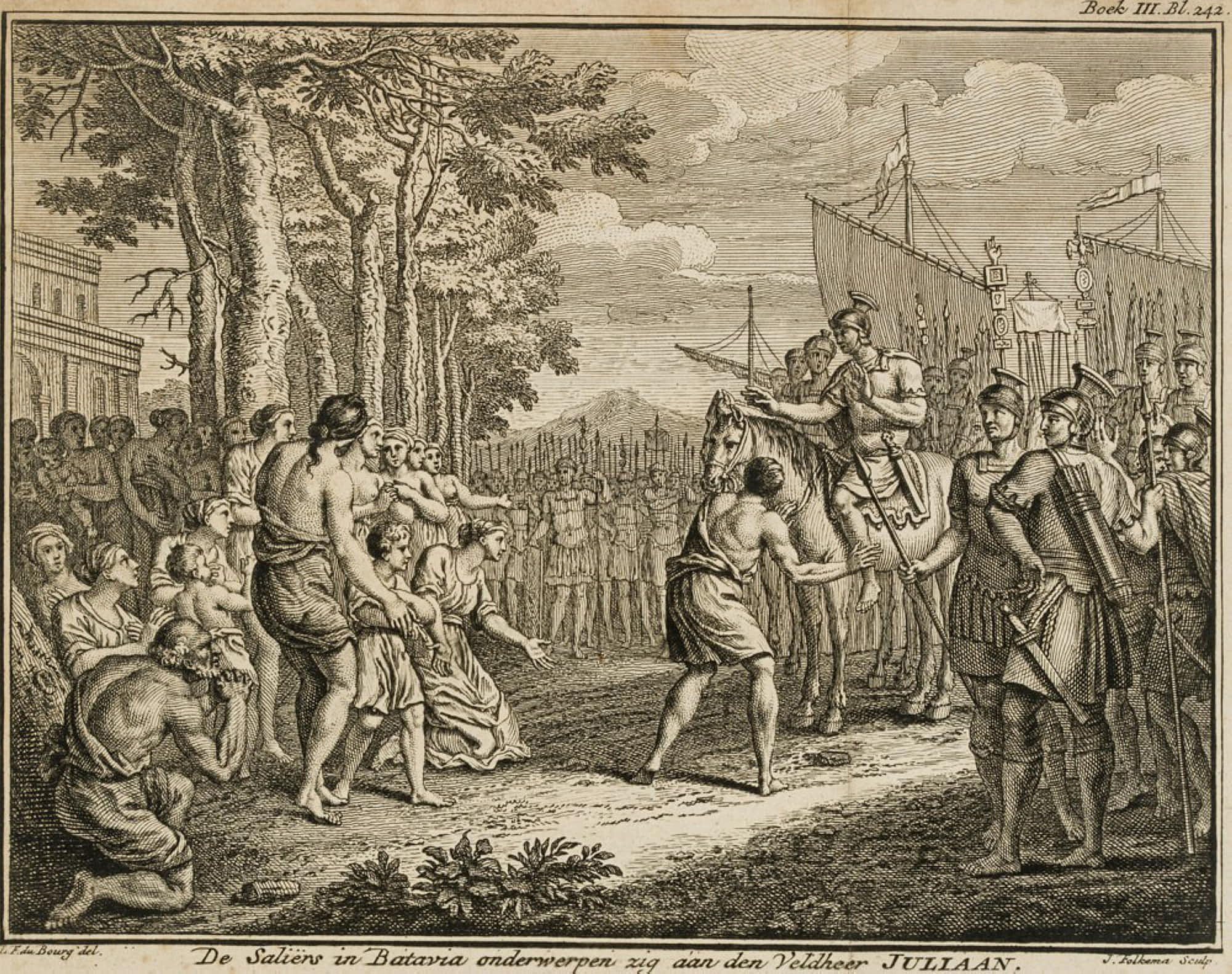 Jacob Folkema (18th century) after Louis Fabricius Du Bourg (18th century), The Batavians submit to Julian, 18th century, Copper engraving