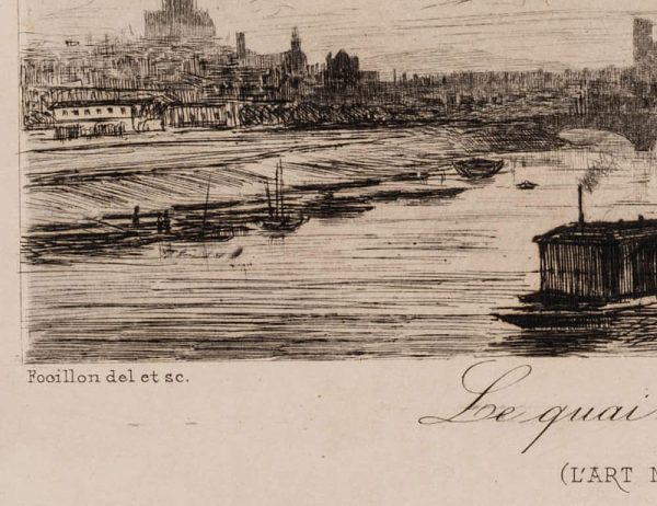 Fooillon (19. Jahrhundert), Le quai de Bercy in Paris, Seine mit Stadtsilhouette, um 1900, Radierung