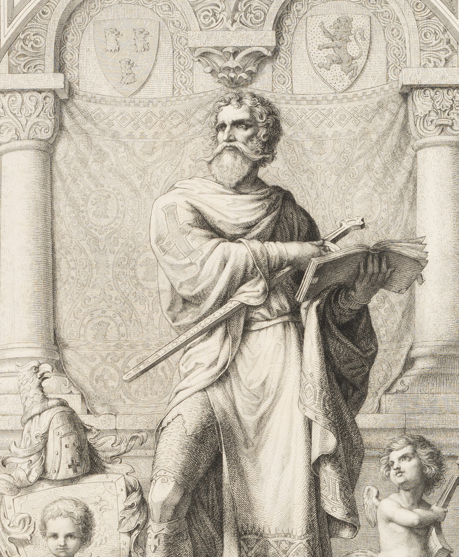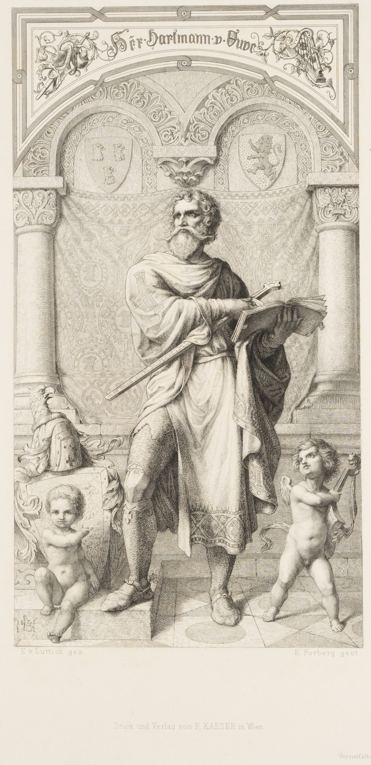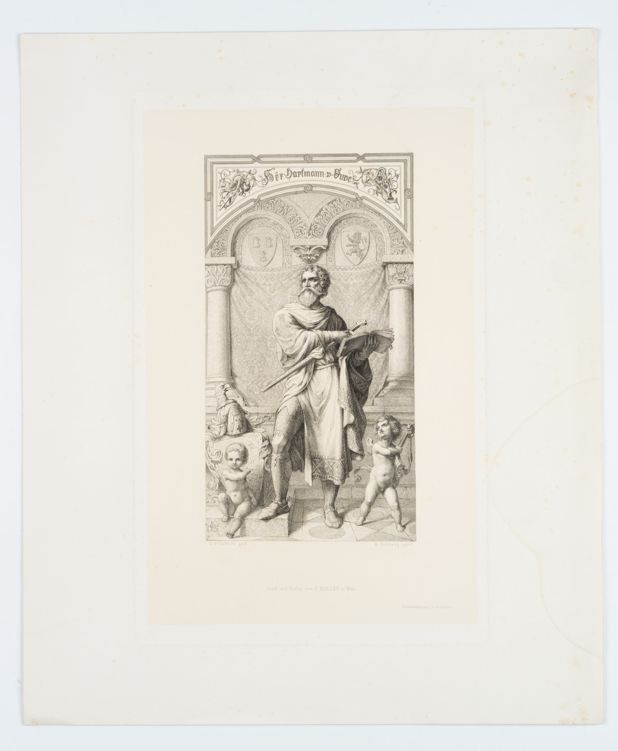 Carl Ernst Forberg (1844 Düsseldorf – 1915 ibid.) after Eduard Luttich von Luttichheim (1844 Prag – 1920 Vienna), Portrait of Hartmann von Aue Full figure standing, flanked by 2 putti in front of a representative portal with Corinthian columns, 1875, Etching