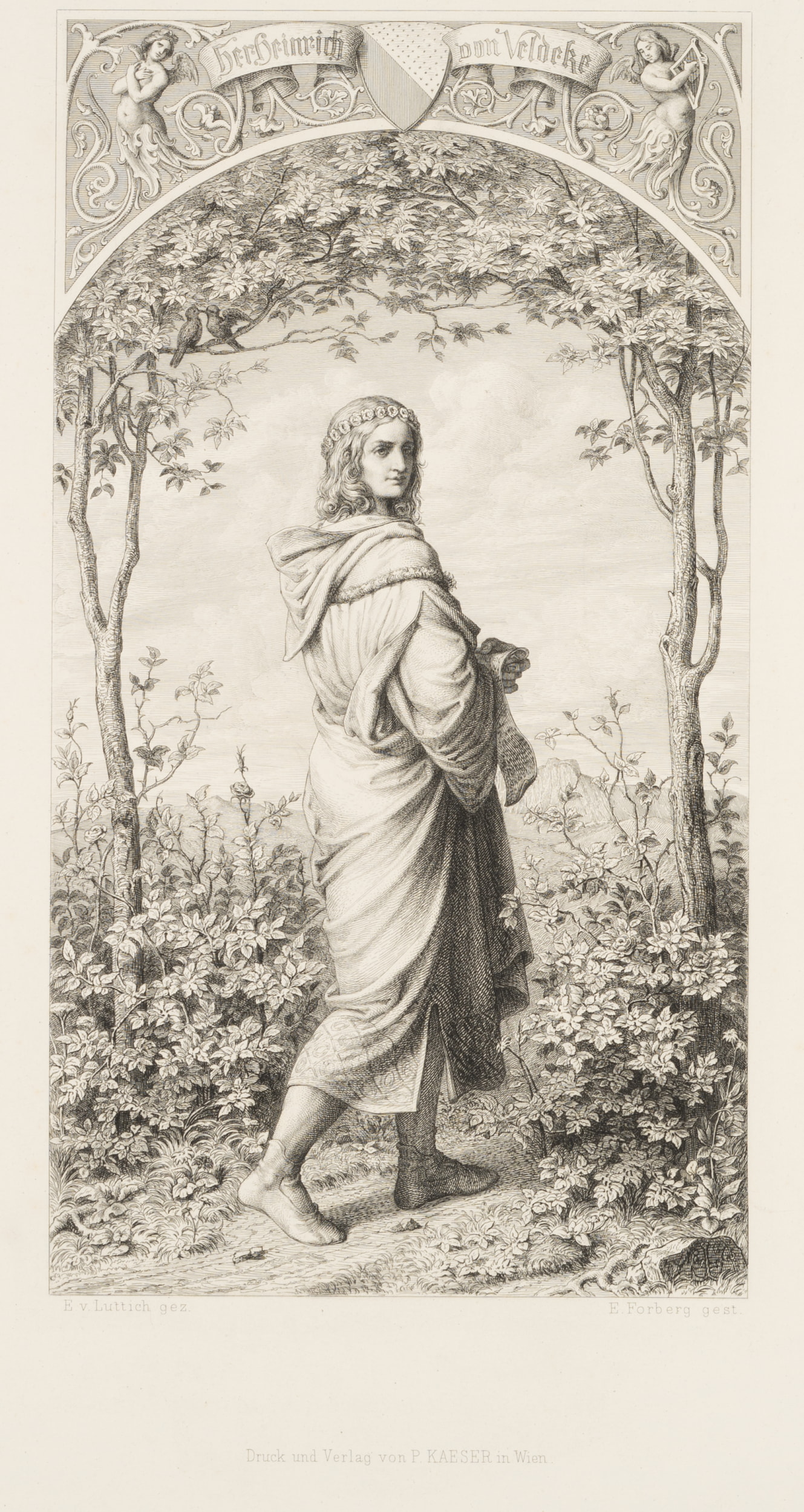 • Inscription: Lower middle signed in the printing plate: “E. v. Lüttich gez. | E. Forberg gest.”. Upper middle inscribed in the printing plate: “Der Heinrich von Veldeke”.