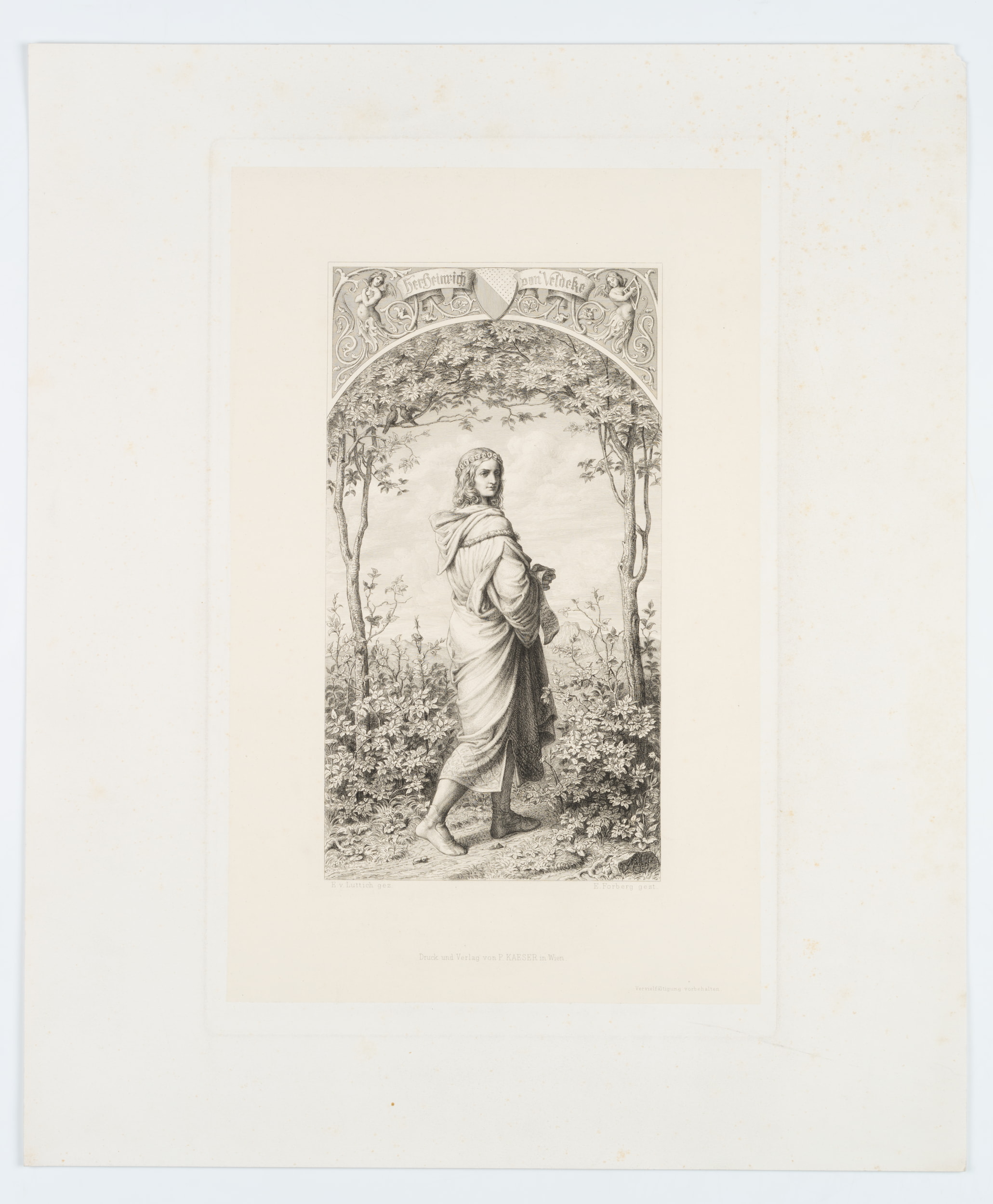 Carl Ernst Forberg (1844 Düsseldorf – 1915 ibid.) after Eduard Luttich von Luttichheim (1844 Prag – 1920 Vienna), Portrait of Heinrich von Veldeke, full-length standing figure in lovely nature, , Etching