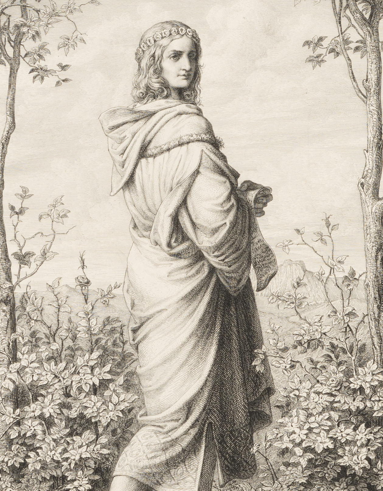 • Schlagworte: Natur, Portrait, natürlich, Blumenschmuck, Dichter, Heinrich von Veldig, Blumenkranz, träumerisch, Triumph, Mittelalter, Mittelalterromantik, Codex Manesse, Porträt, Deutschland, Romantik, 1850-1899