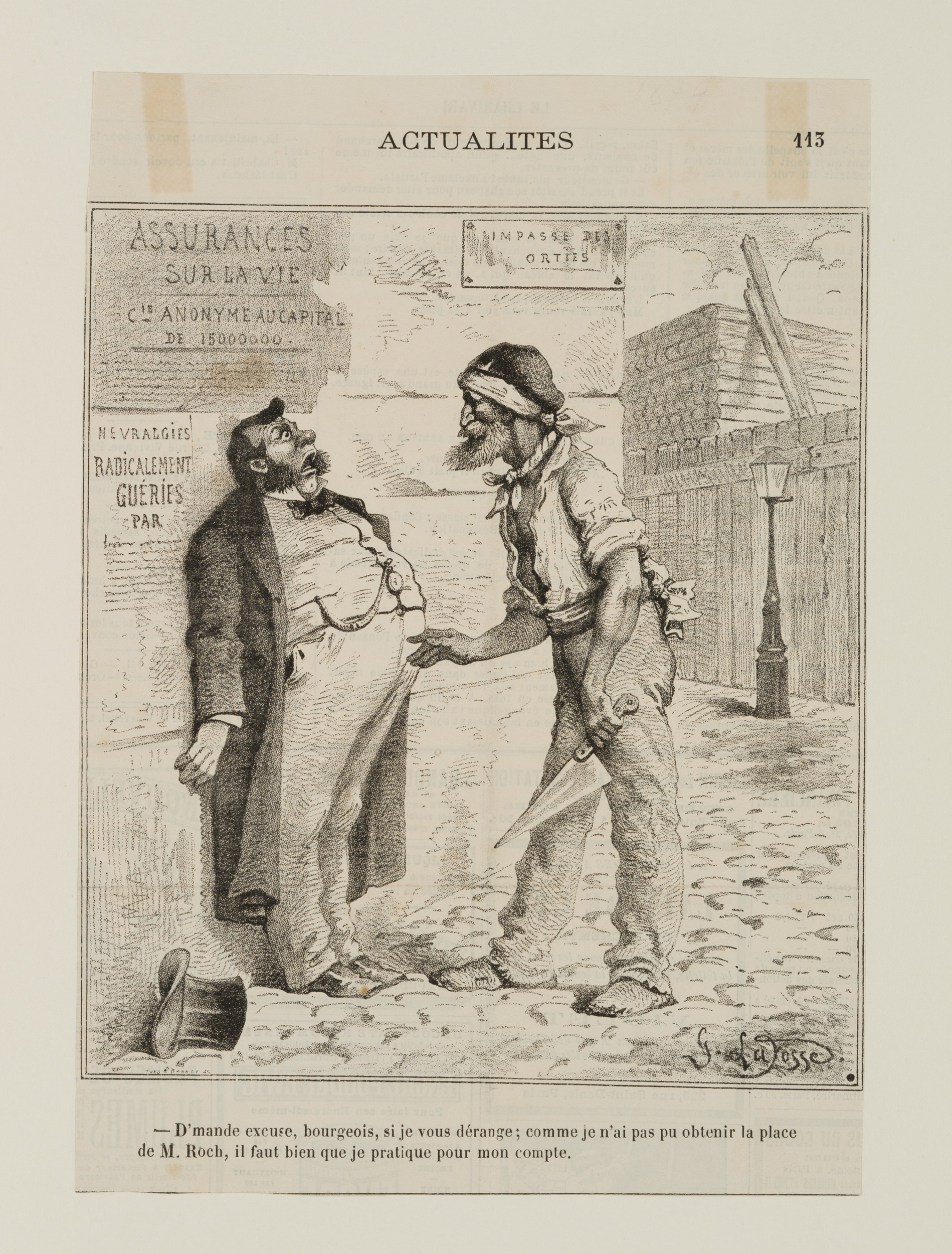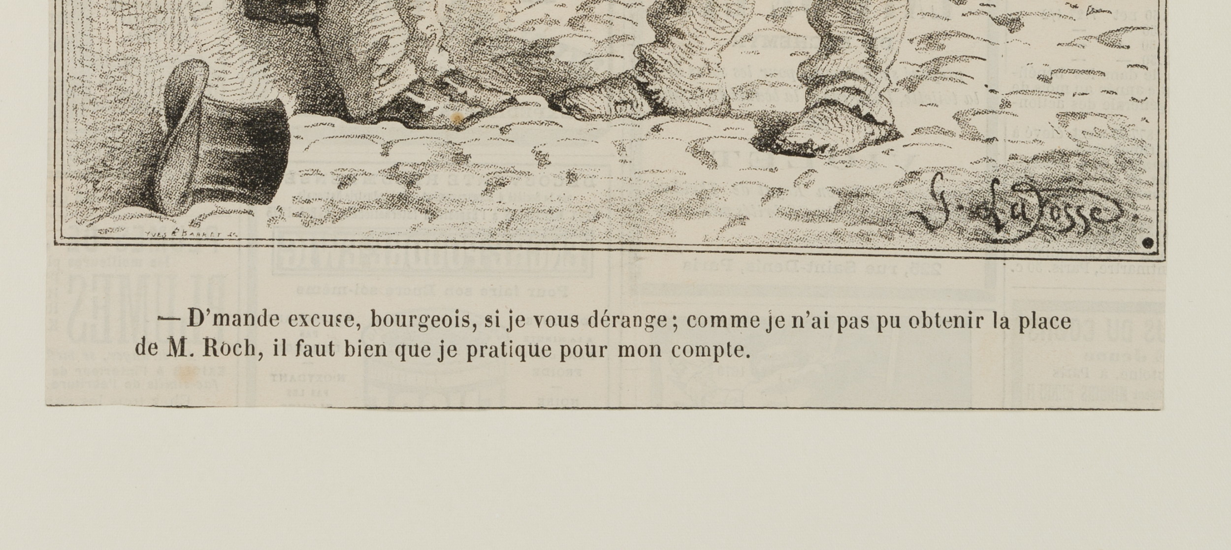 Caption. Translated from French: “Sorry citizen, if I’m disturbing you; since I couldn’t get the job from Mr Roche, I guess I’ll have to work on my own account.” - Verso: Typographic printing, advertisements.