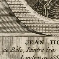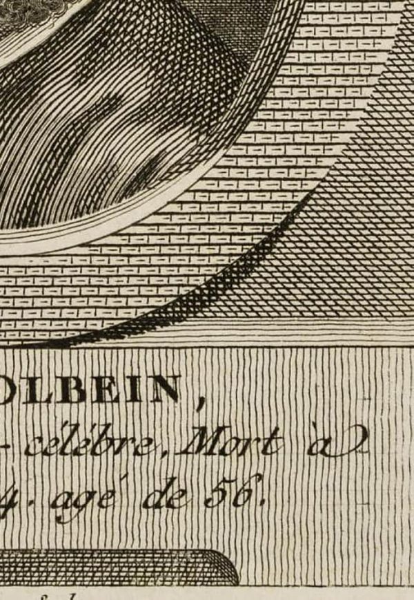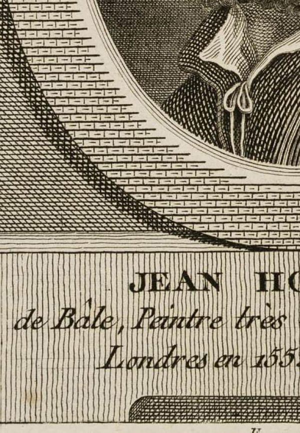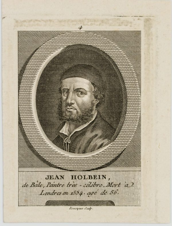 - Beschreibung: Abbildung unterhalb mit dem Namen des Abgebildeten “JEAN HOLBEIN” bezeichnet. Darunter mit “Fosseyeux Sculp.” signiert und oberhalb mit “4” nummeriert.