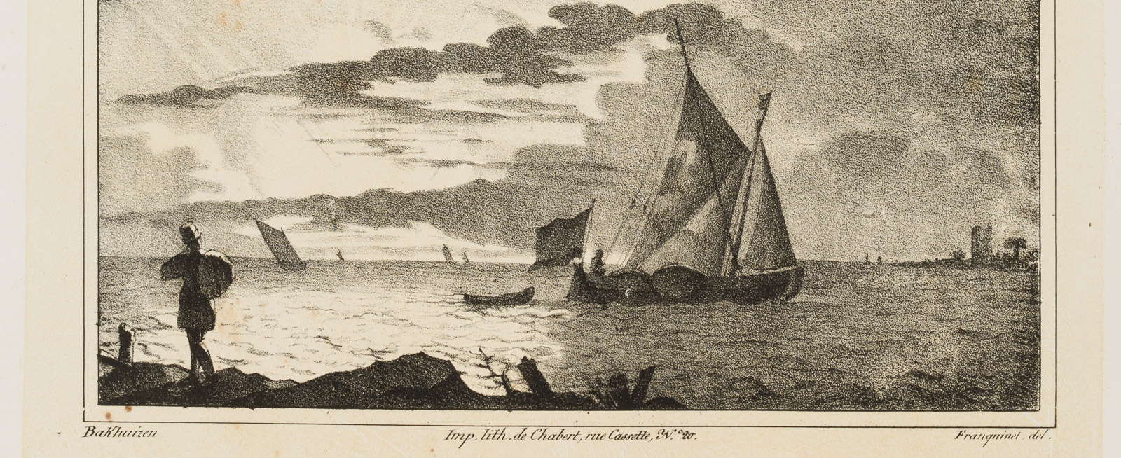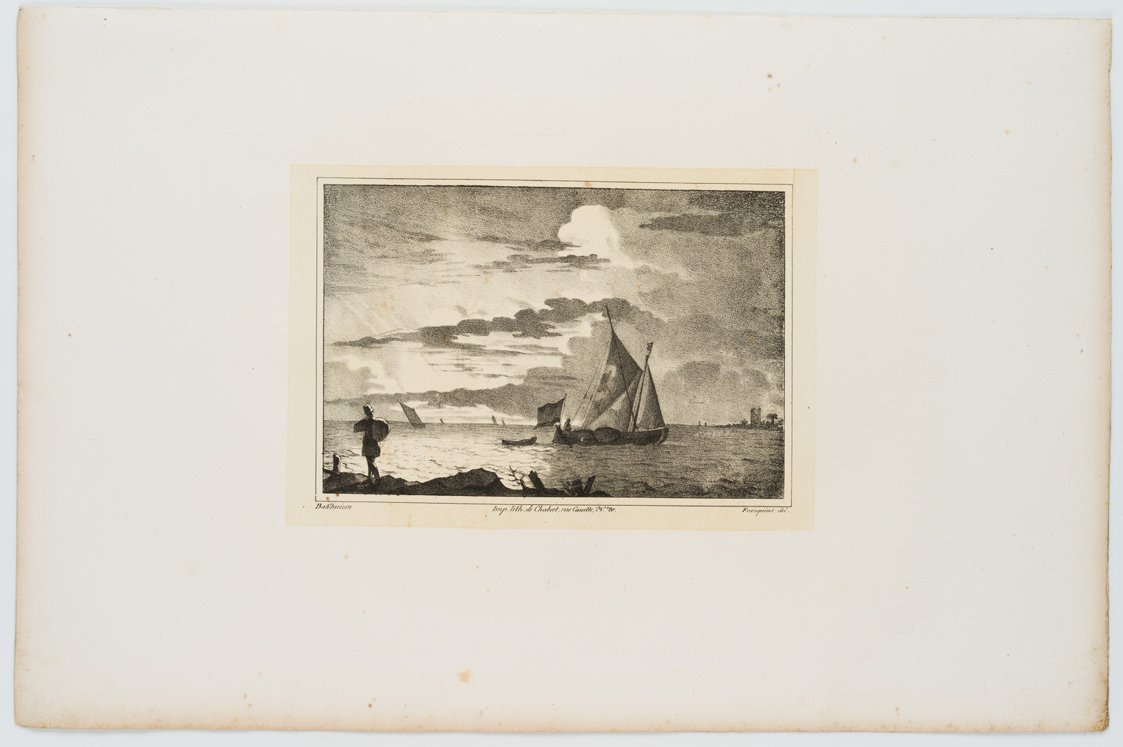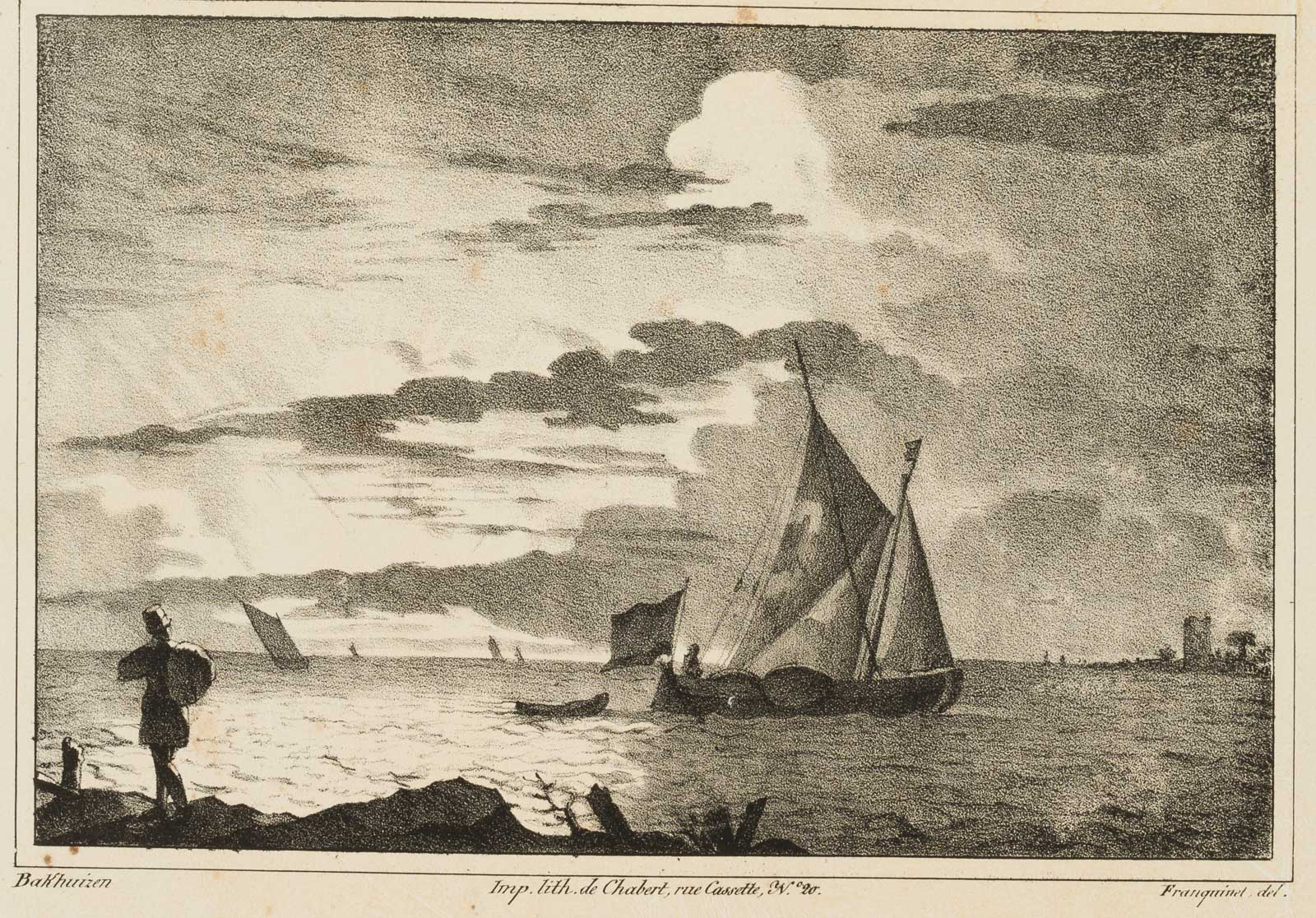 Willem Hendrik Franquinet (1785 Maastricht – 1854 New York) after Ludolf Bakhuizen (1630 Emden – 1708 Amsterdam), View from the shore to the open sea with sailing ships. Old Masters, 19th century, Lithography