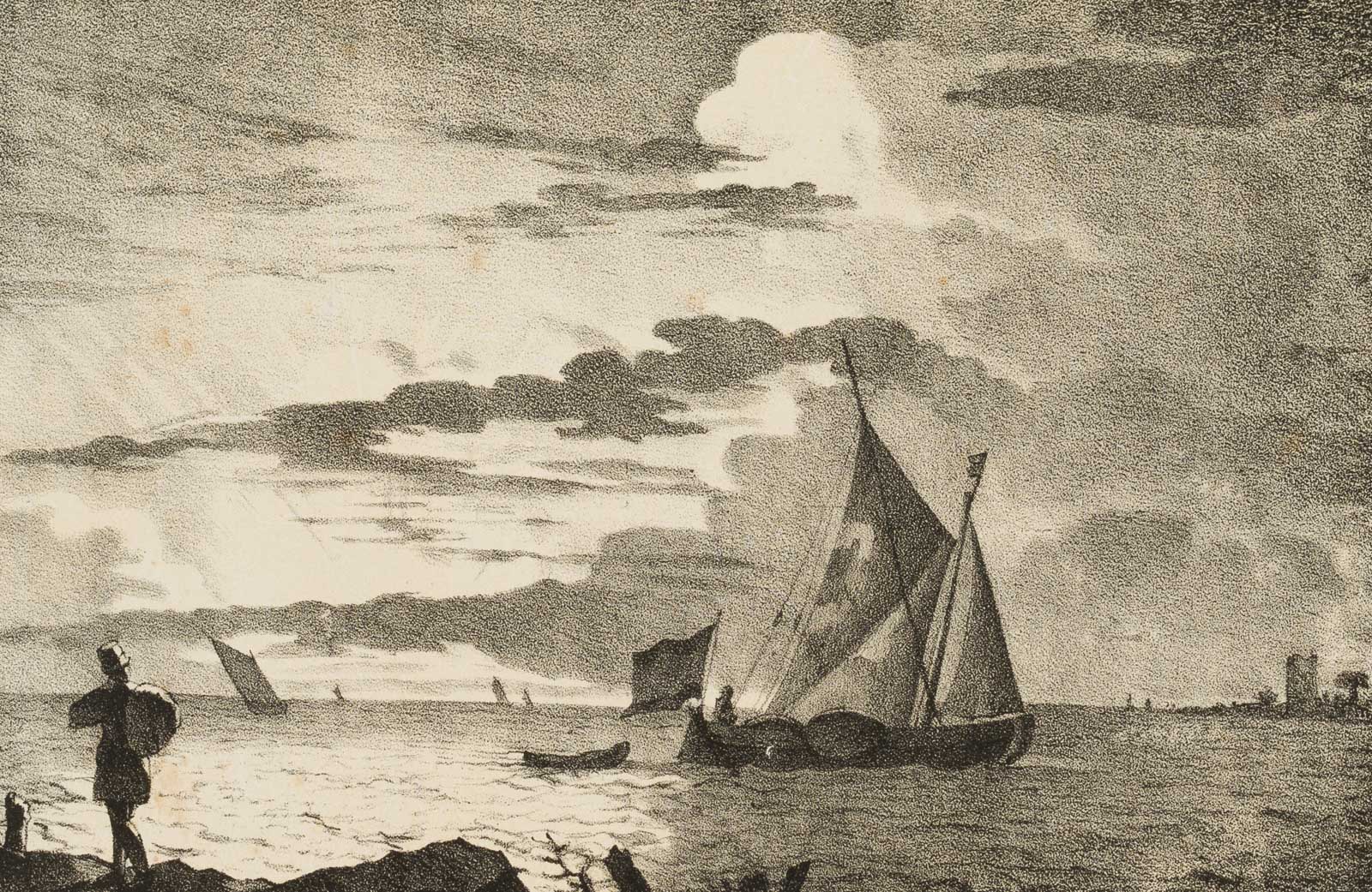Willem Hendrik Franquinet (1785 Maastricht – 1854 New York) nach Ludolf Bakhuizen (1630 Emden – 1708 Amsterdam), Blick vom Ufer auf offenes Meer mit Segelschiffen. Alte Meister, 19. Jahrhundert, Lithographie