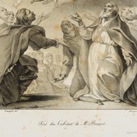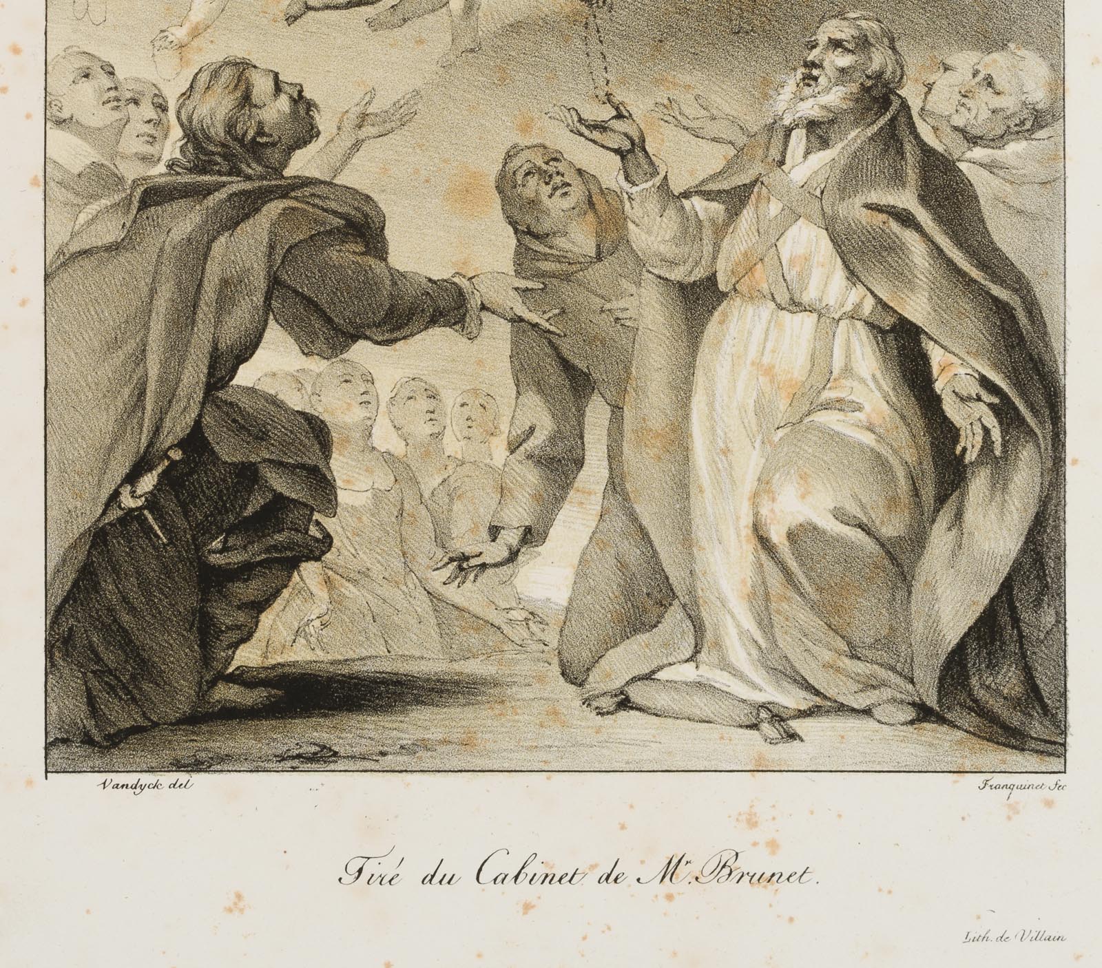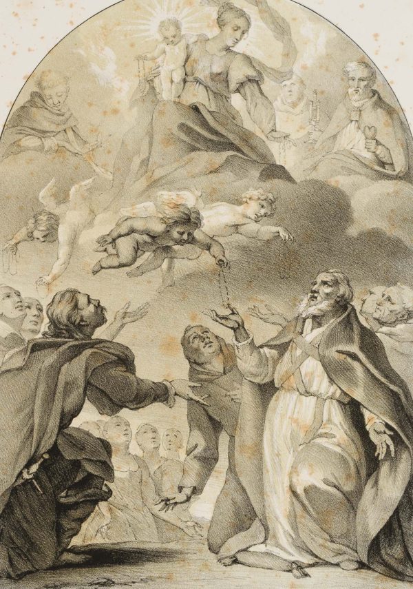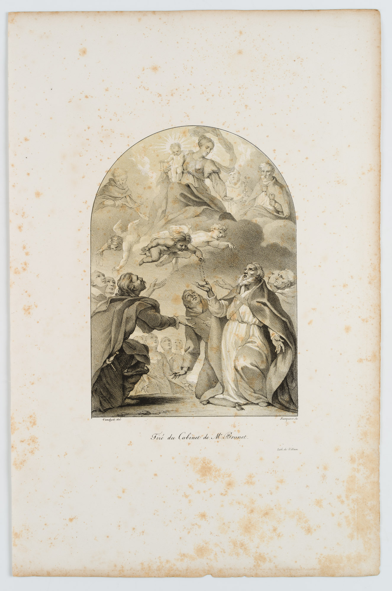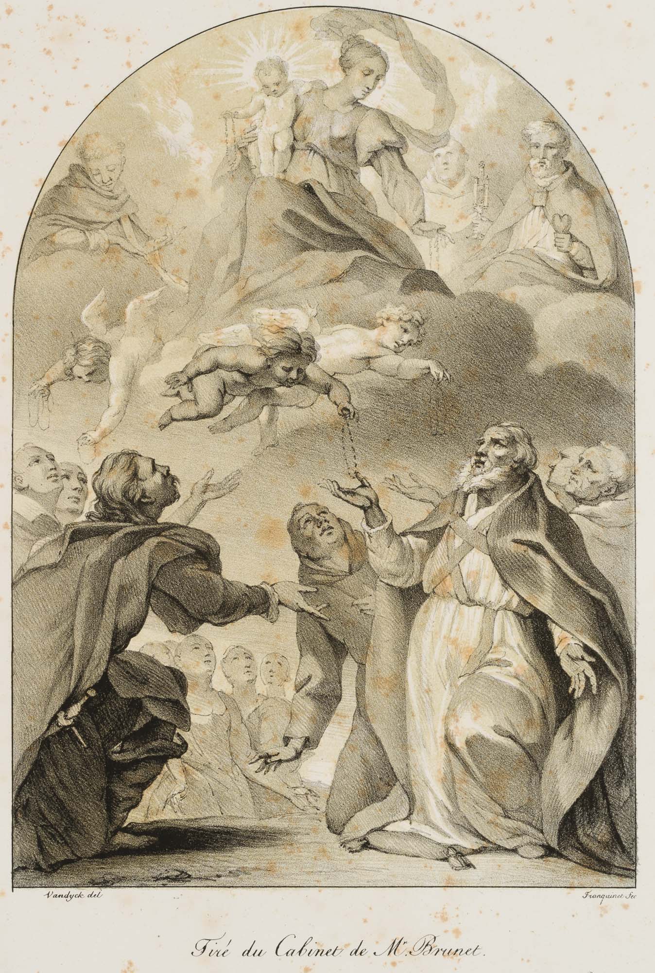 Willem Hendrik Franquinet (1785 Maastricht – 1854 New York) after Anthonis van Dyck (1599 Antwerp – 1641 London), Madonna of the Rosary. Madonna and angelic retinue distribute rosaries to men in religious habit. Old Masters, 19th century, Lithography